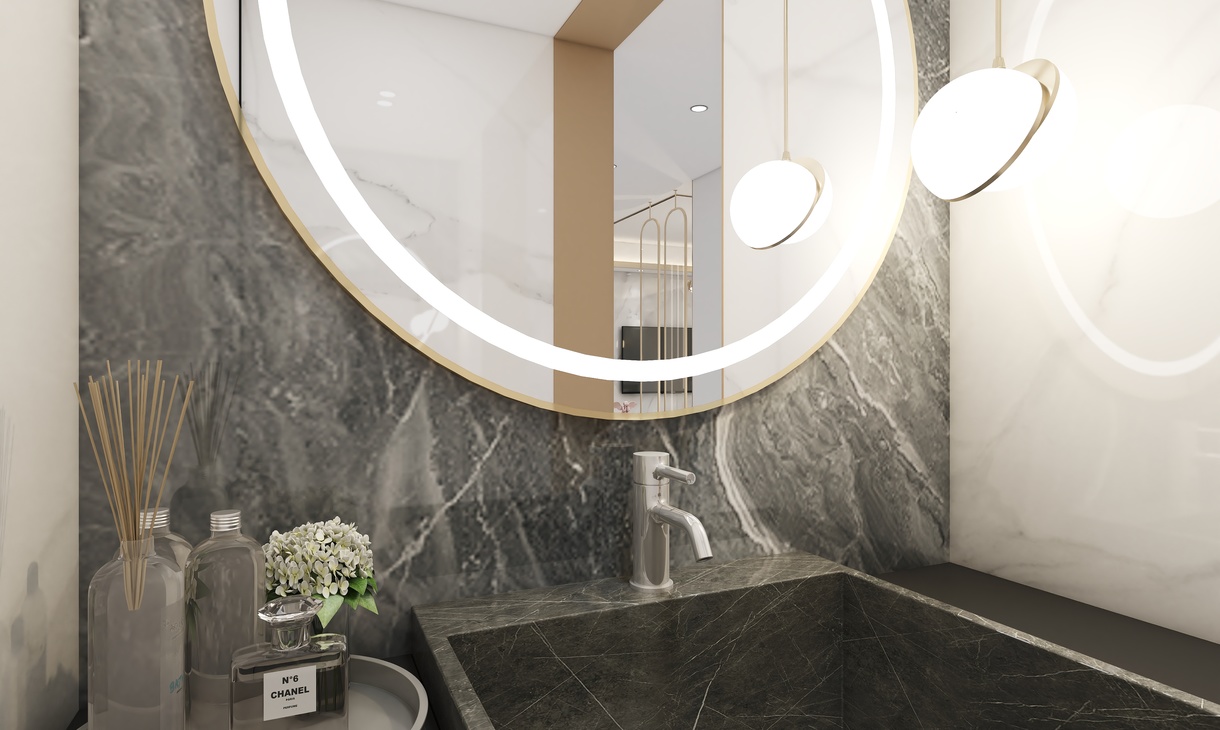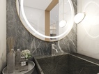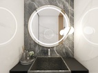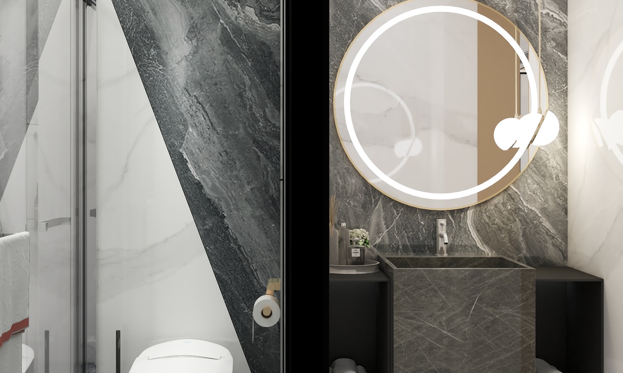 干区设计以台盆背景为主,运用了深色的大理石大板砖,于另外3面白色大理石大板砖搭配,突出了台盆区域的重要性,加上灯光的点缀,让空间不再感到寒冷。