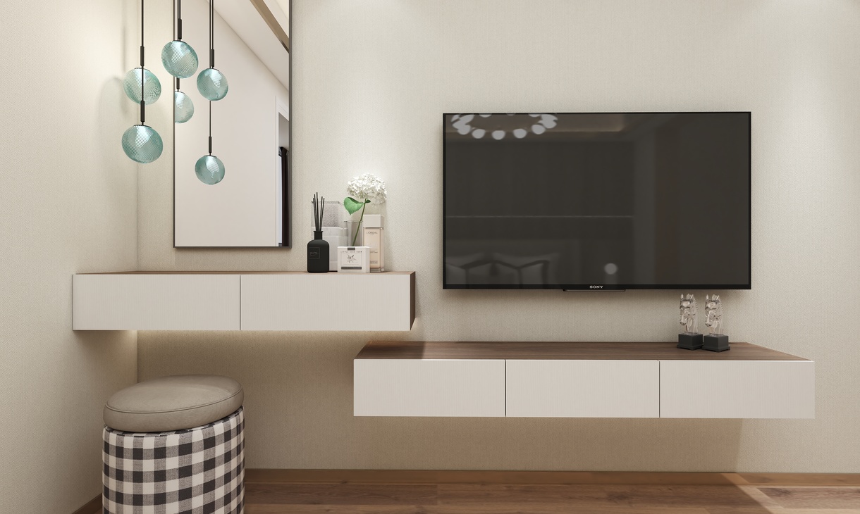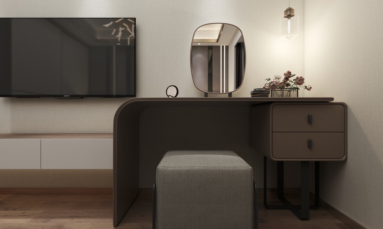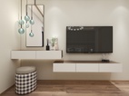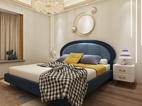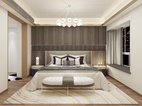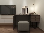 主卧的设计以简单舒适为主题。背景墙的胡桃木的设计拥有强烈的木纹质感,电视柜柜体采用了胡桃木与白色的套色设计,电视柜于梳妆柜的设计,错层设计让空间利用的同时,还能兼顾储藏空间。软装布艺方面以简单色为主。整体视觉上温馨舒适。