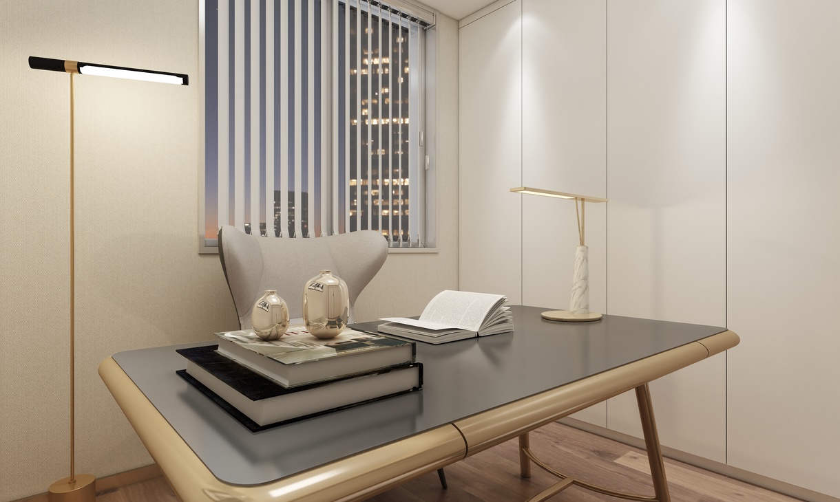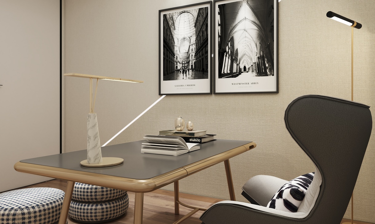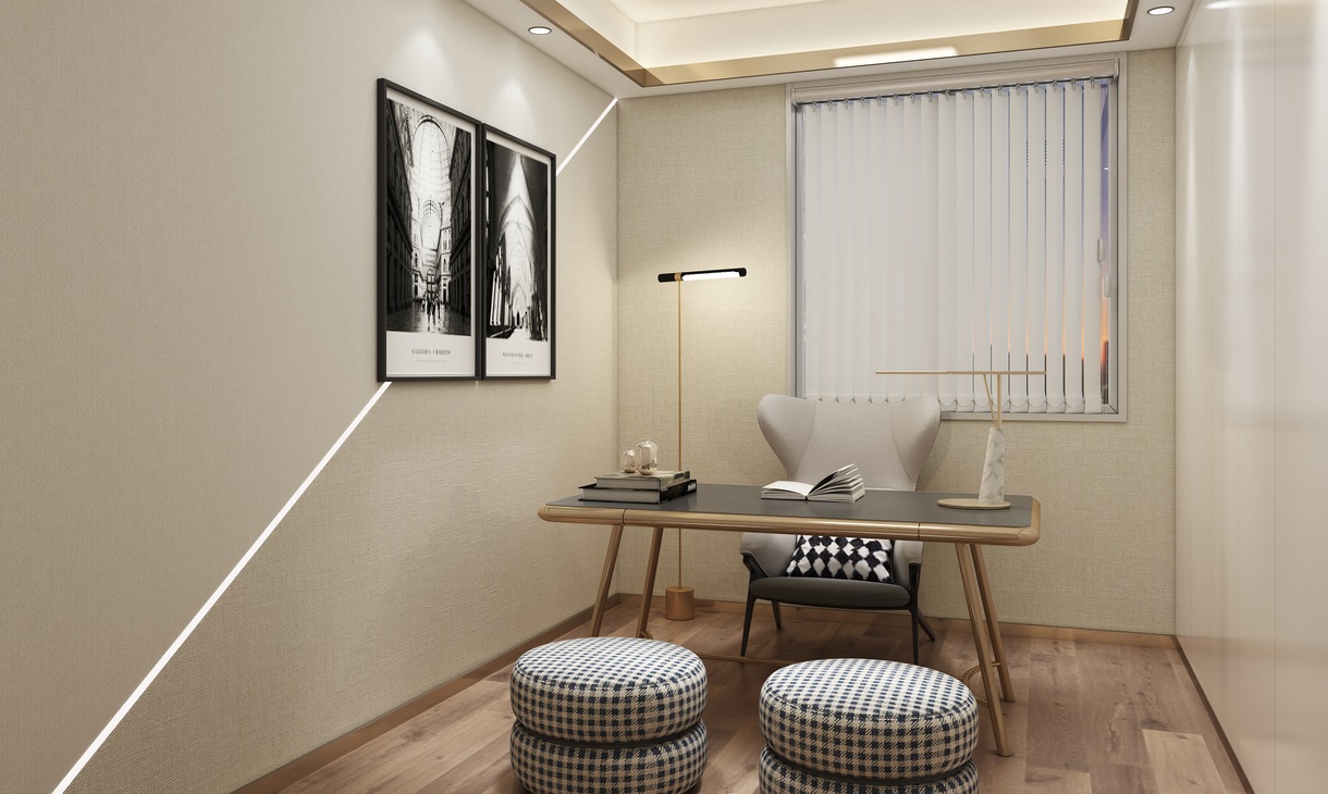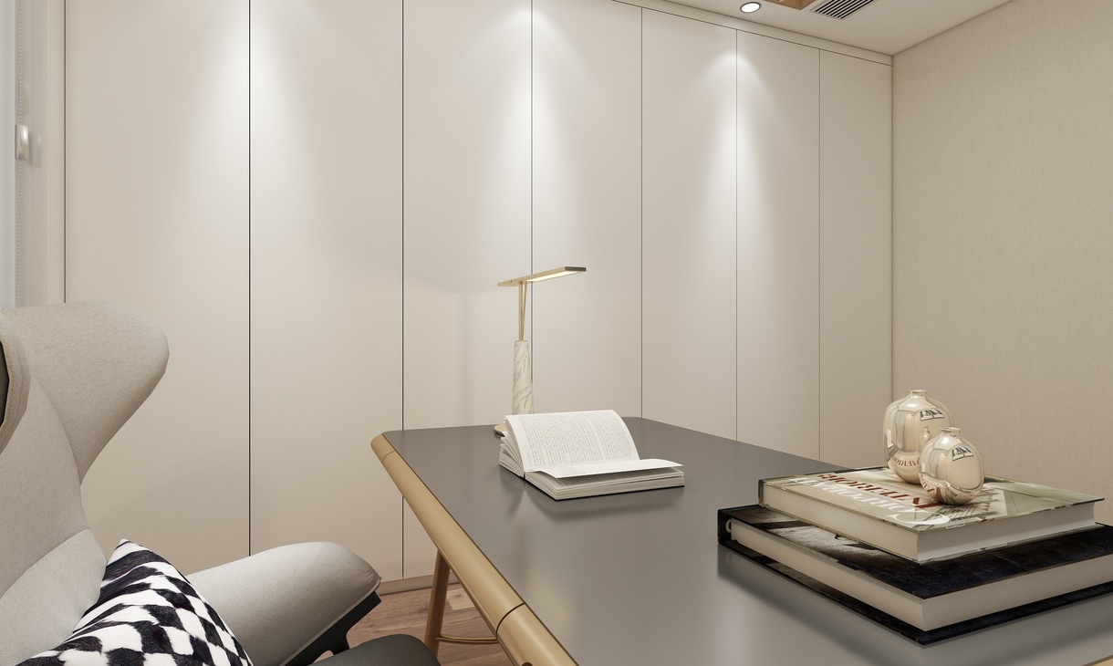 书房在用一整面墙做了柜体设计。白色的柜体门板设计让风格更加统一。一张书桌,一张沙发,让人安静的坐在上面,静静地工作。