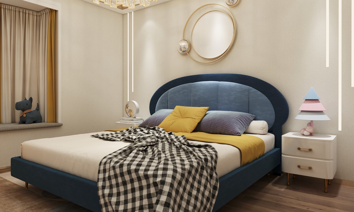 儿童房以简单为主,蓝色的大床搭配黄色的软装,凸显出个性化的搭配。简单的设计也让儿童房有个舒适的环境。