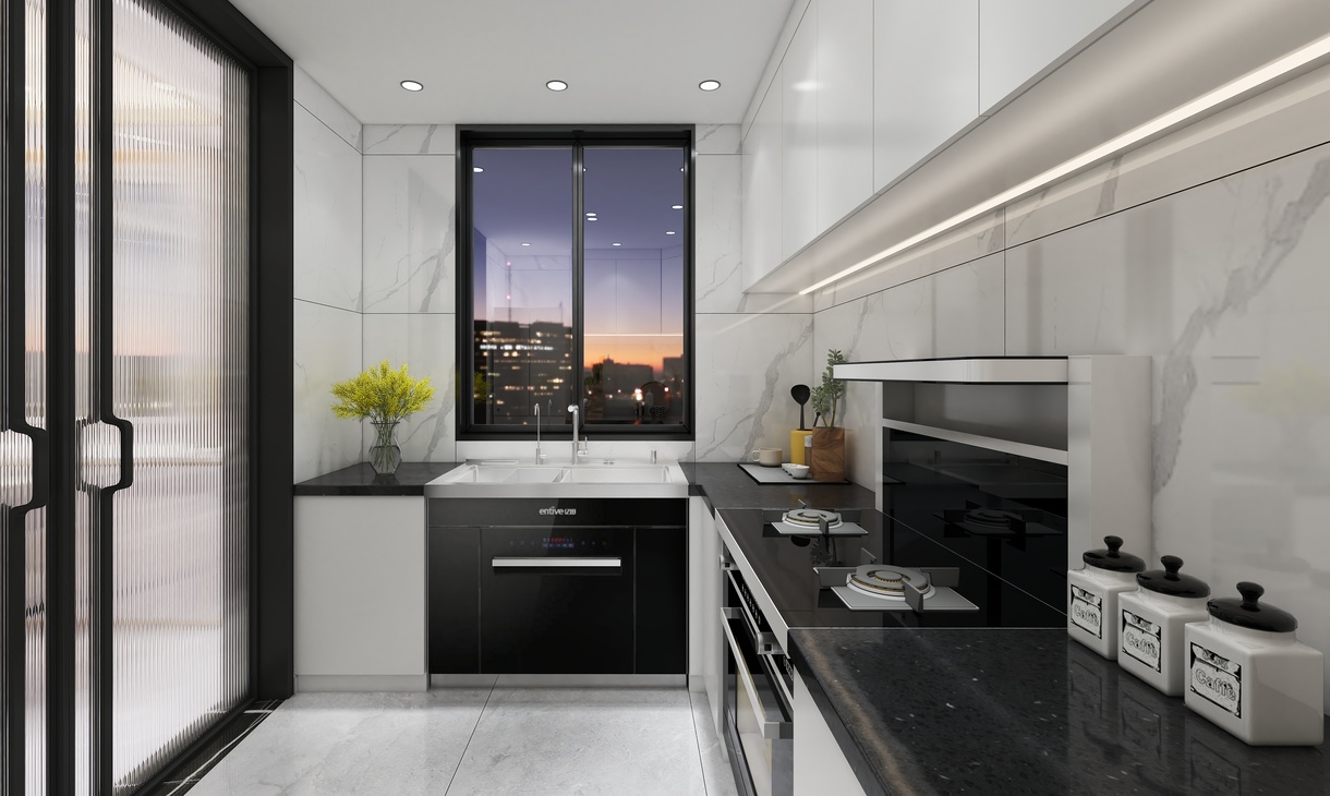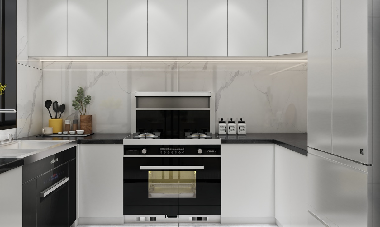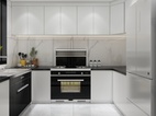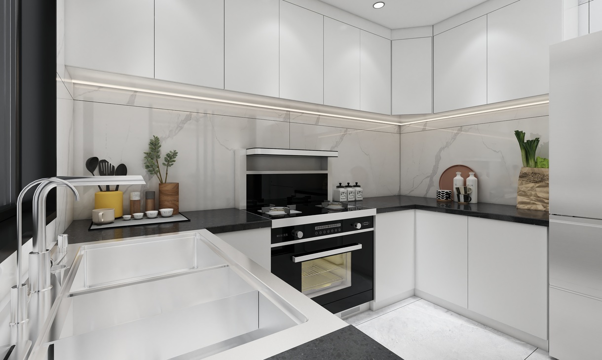 整体柜体白色为主,搭配集成水槽与集成灶,加上灯光搭配,让整体橱柜看上去更加现代感。地砖于餐厅协调一致,搭配墙面白色大理石纹理750*1500瓷砖,整体干净清爽。