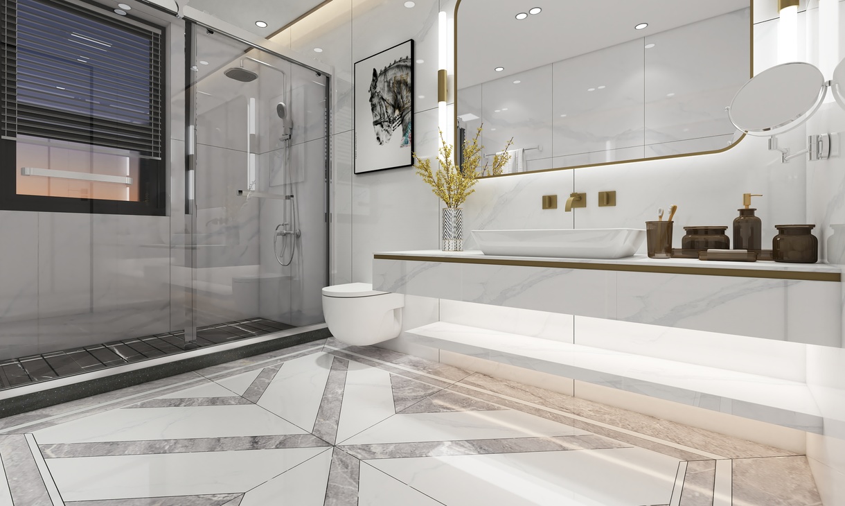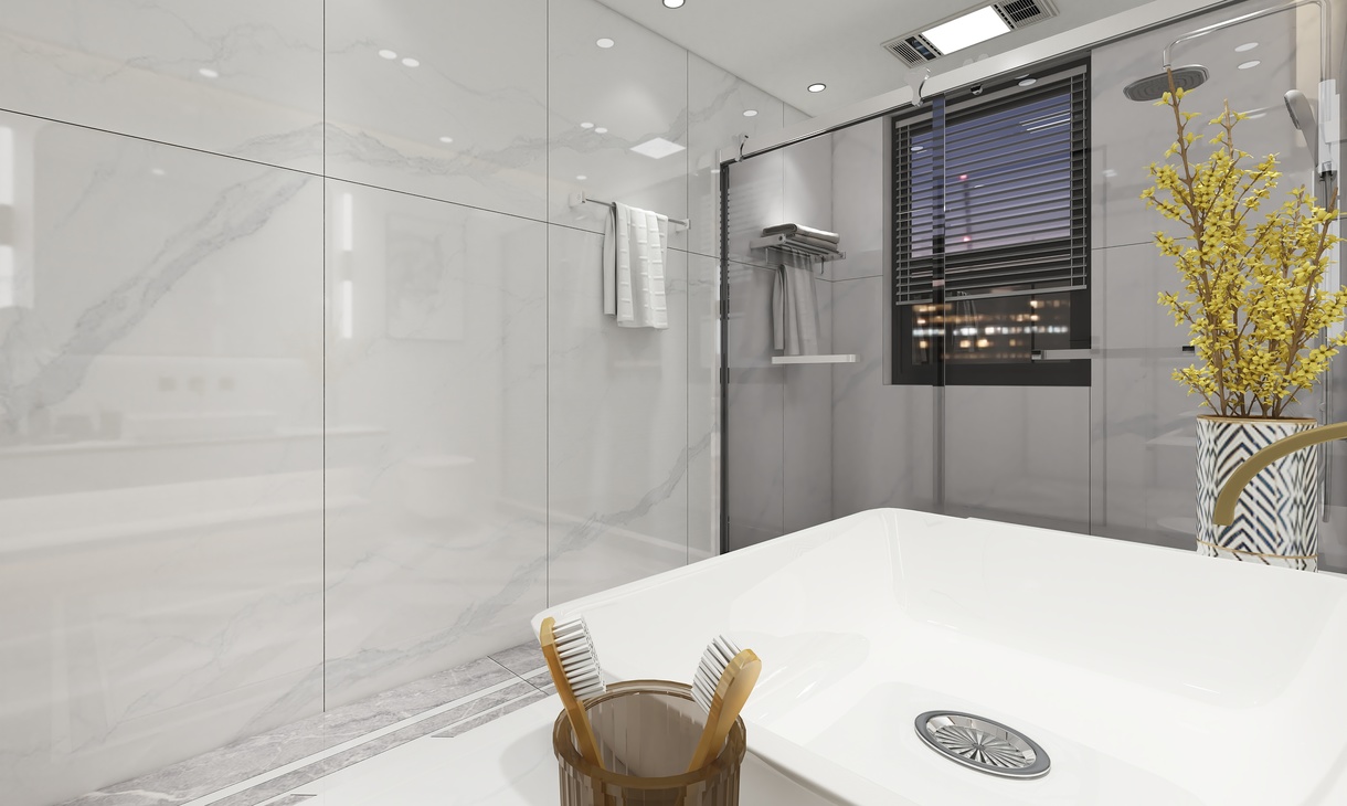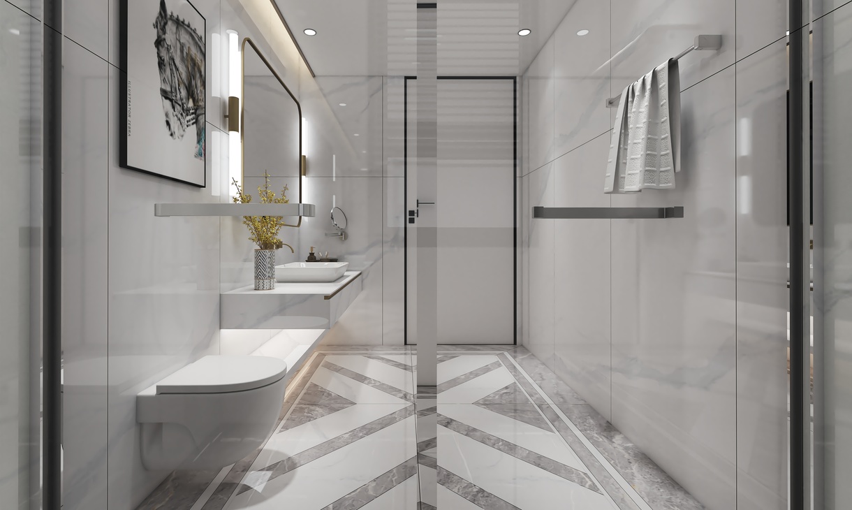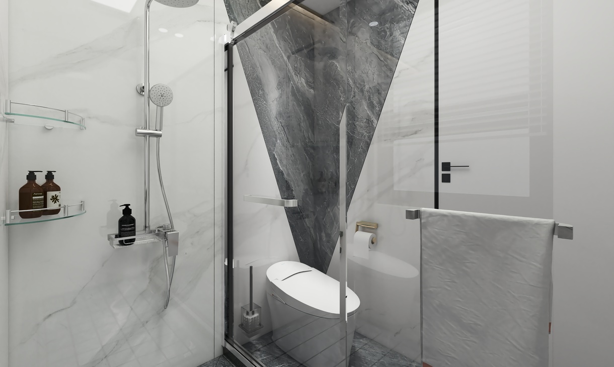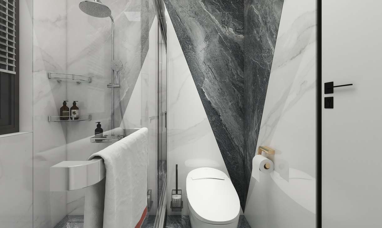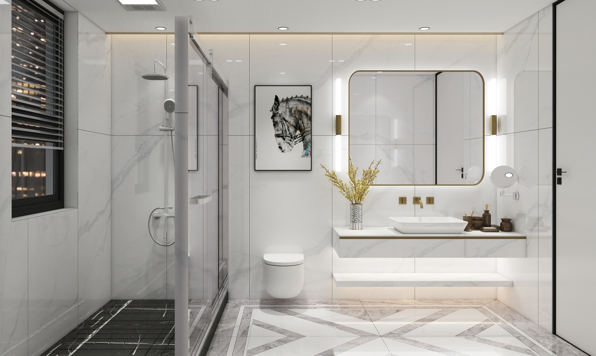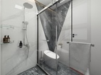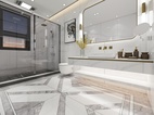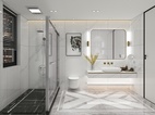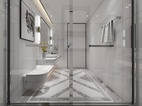主卫以简洁为主,地面采用了简单水刀造型,时尚中带有一点轻奢,对称的造型也更具立体感。墙面采用了750*1500连纹大板的设计,让整个卫生间的墙面全部连纹,简约大气。