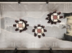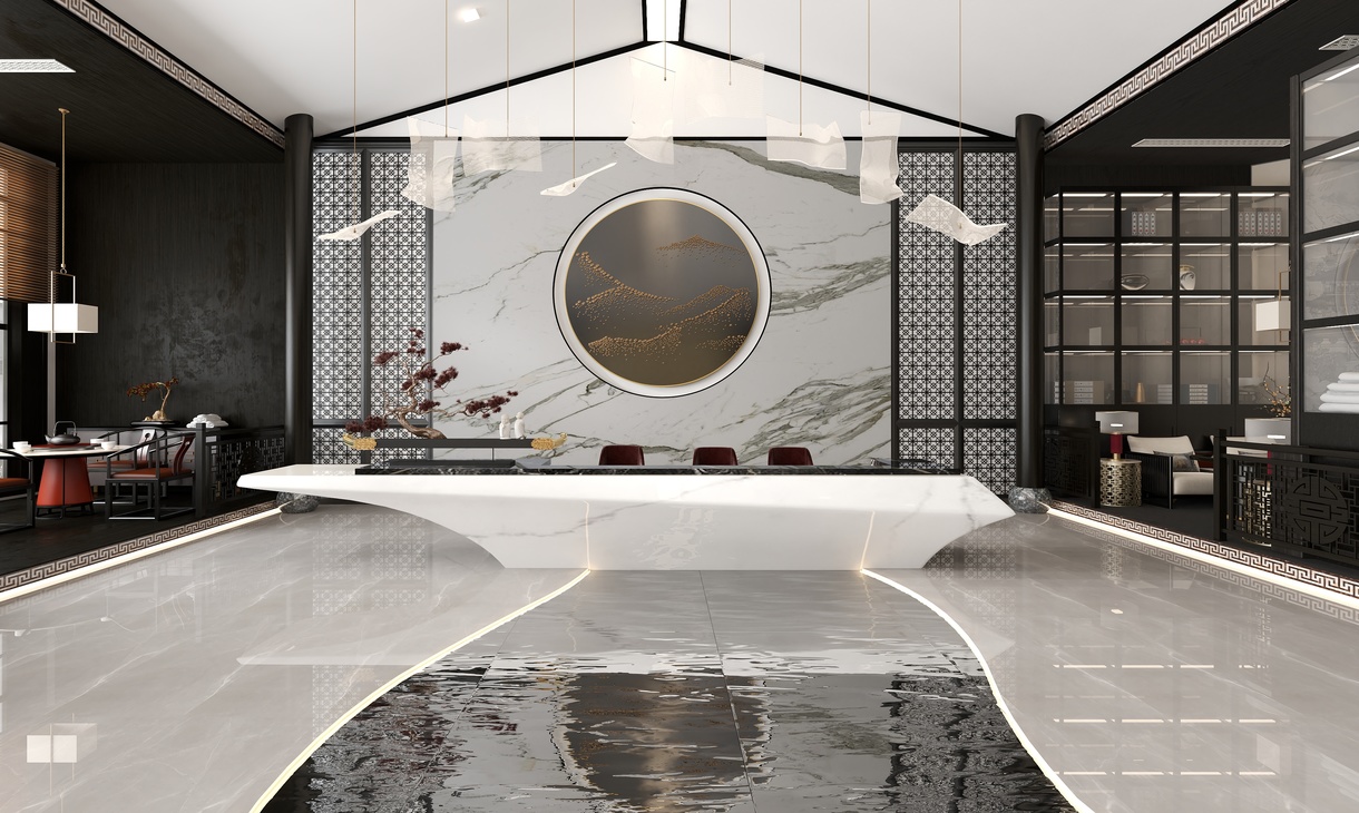 我独自走上高楼。设计上采用刻有古楼画的中式屏风来映衬,利用抬高地台将层次感搭建,走上高楼,只有勇于登高远望者才能寻找到自己要达到的目标。