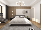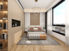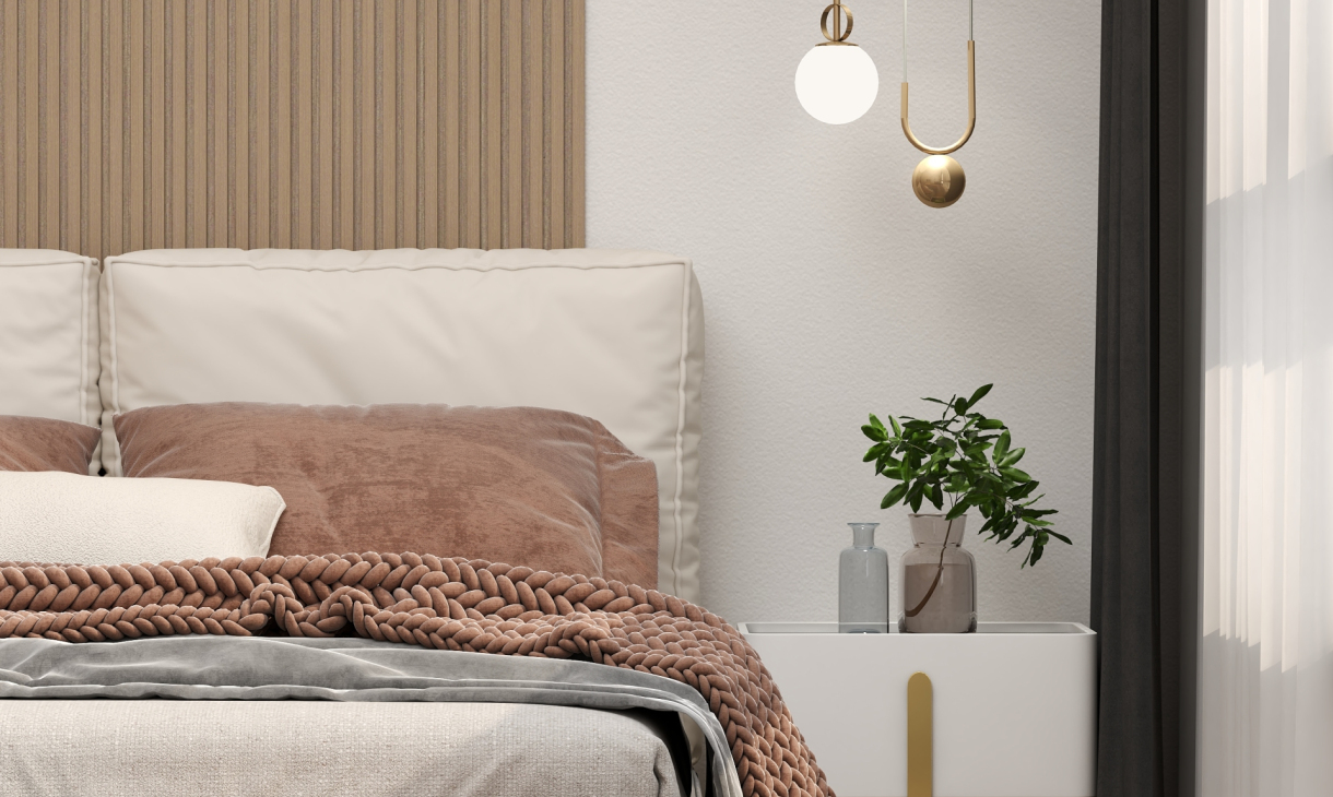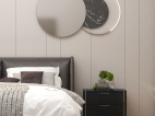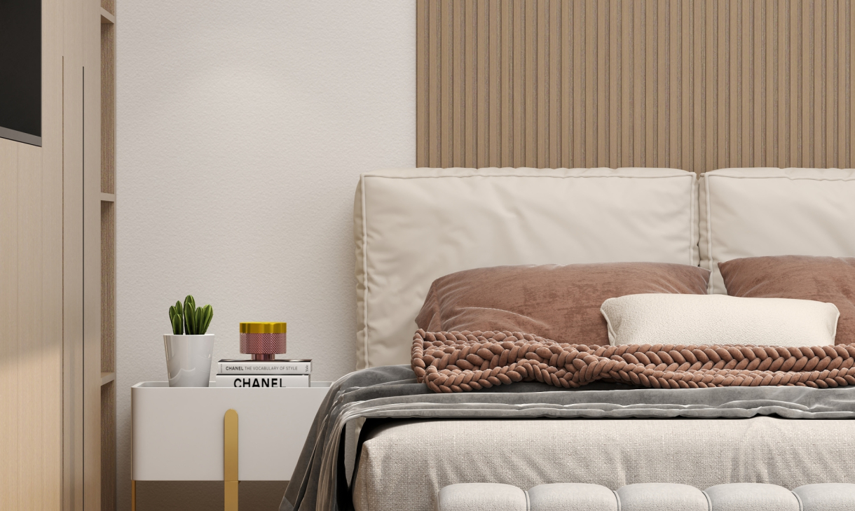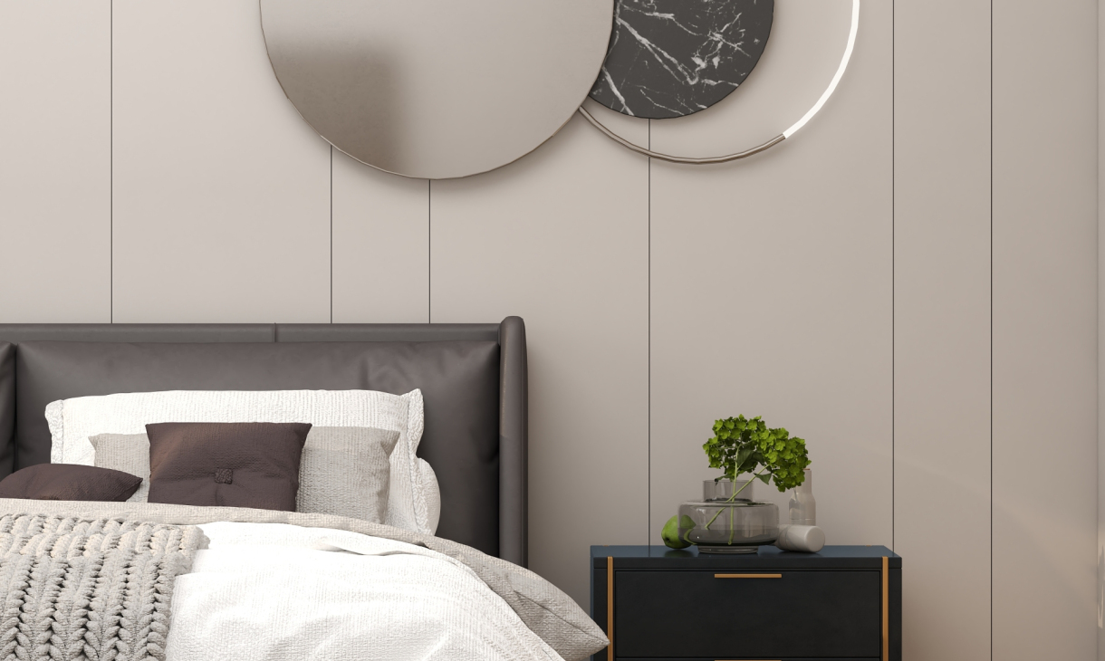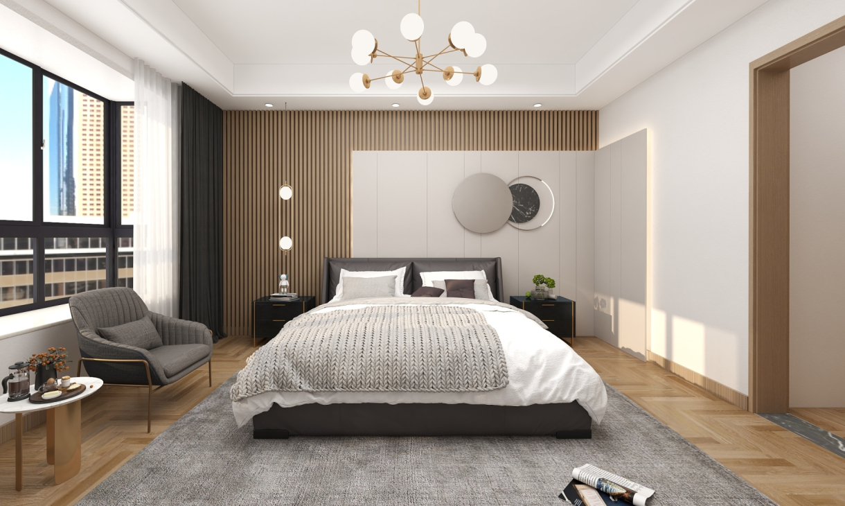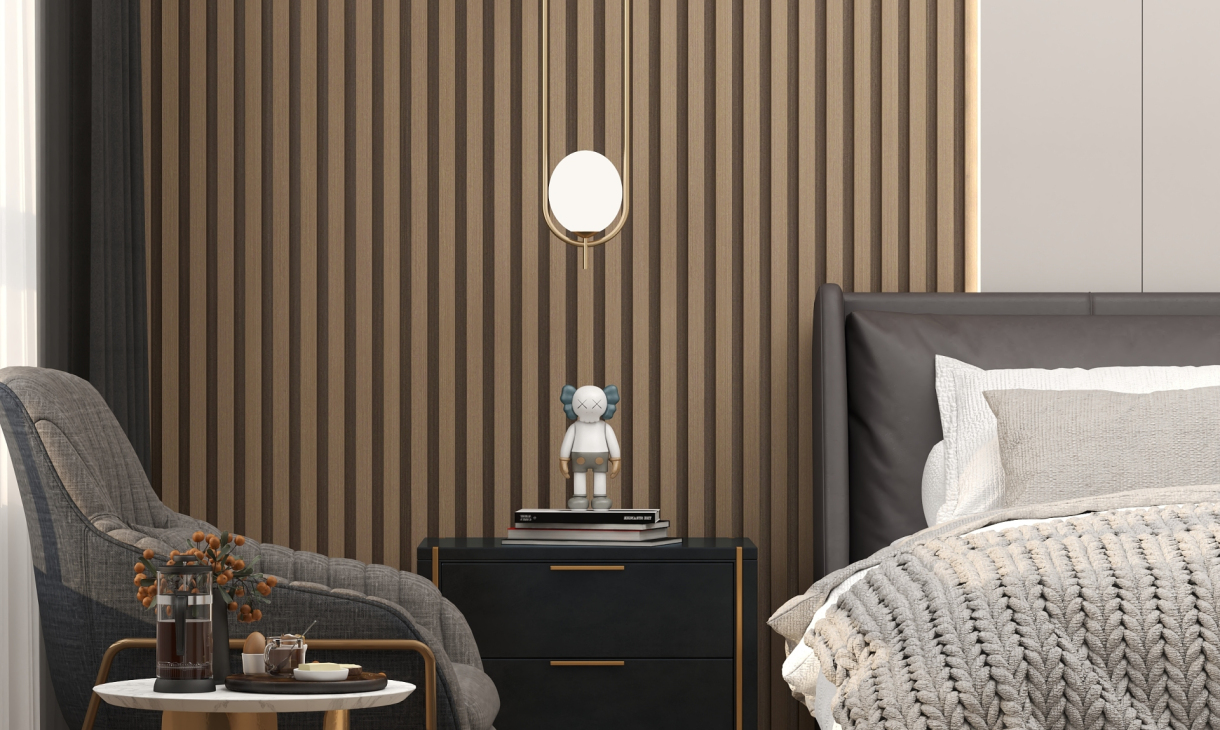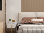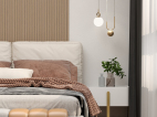 床头背景用木纹格栅于纯色木饰面做的造型,在加入线型灯制造出层次感。纯色木饰面的转角联动右边的墙体。让整体空间更加饱满。