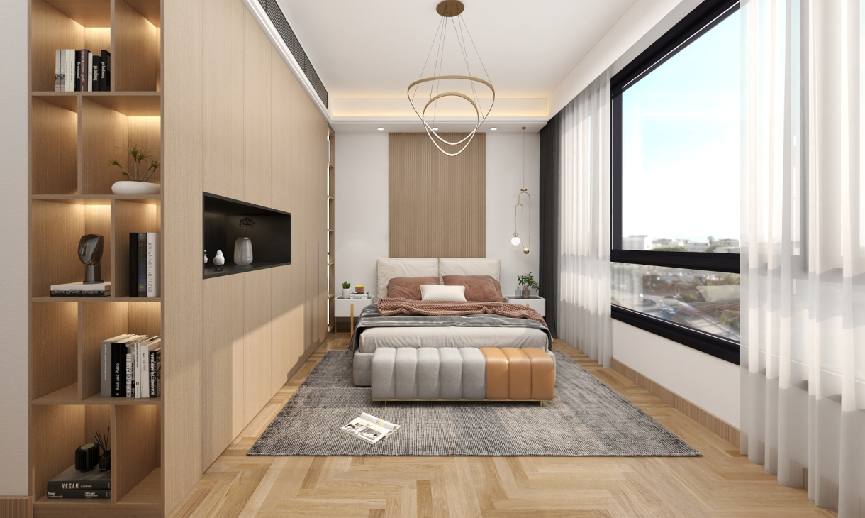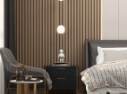 衣柜侧面受空调进风口的影响,于是设计了一个开放式侧边柜,可以收纳书籍,或摆放饰品。床头也是采用的木纹格栅做的背景,加上一个鱼线吊灯。简约又富有意境。