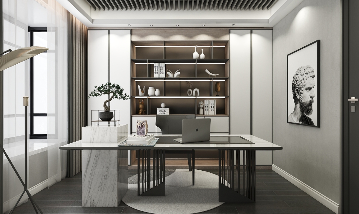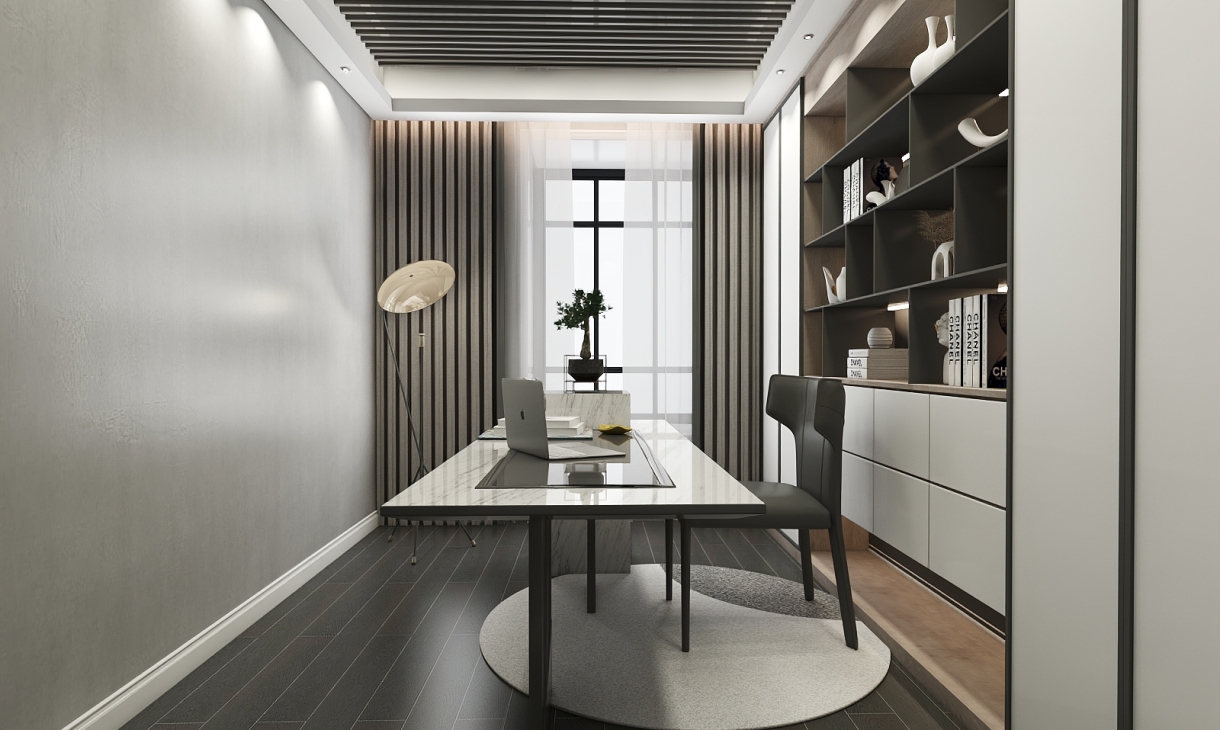 打造一个书房是每个人都想要的,轻奢后现代并不是简单地恢复历史,是在理性的当下打造自己的真实空间,这就是时代和时尚的生活态度的写照,而这里的家具及软装好物就能体现主人的生活品位与喜好。▲定制书柜利用了墙体的厚度,将书柜隐藏,满足业主的大量收纳需求后,不再使用实体柜门来破坏整个空间,而是让房间多了一处“小小储物”柜体,不显压迫,而且充分利用了空间的同时也提高了储物容量。
