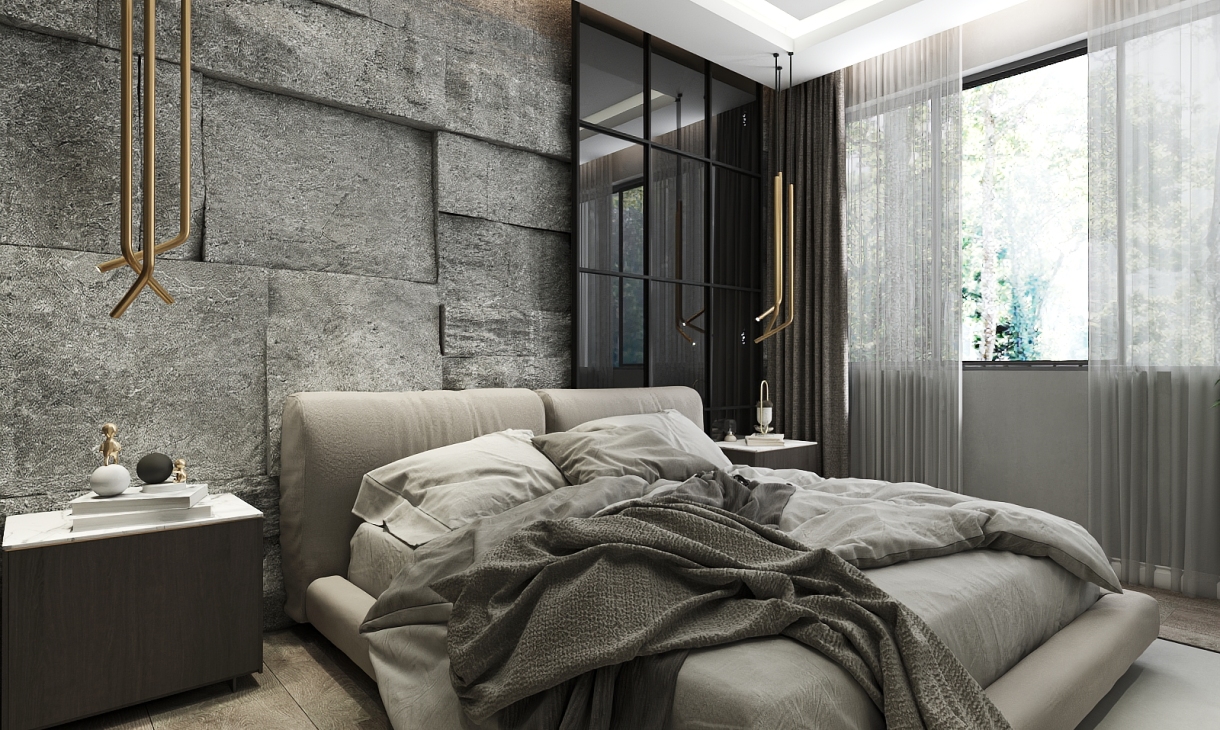 整个屋子的布局与装饰,完全不用直线,用水泥,主要构建一个简单的空间,没有过多的结构语言,在软装材料上搭配跳色,大面积的浅灰色以及蓝色搭配轻松自然的简约工业卧室。同时,选用灰色皮艺窗帘和黑色窗框作为反差,打造出极具年轻个性的轻工业空间。