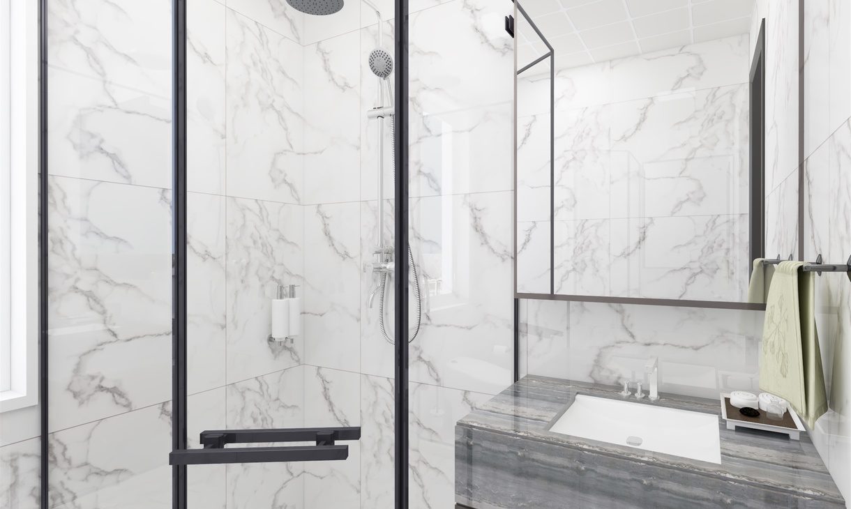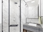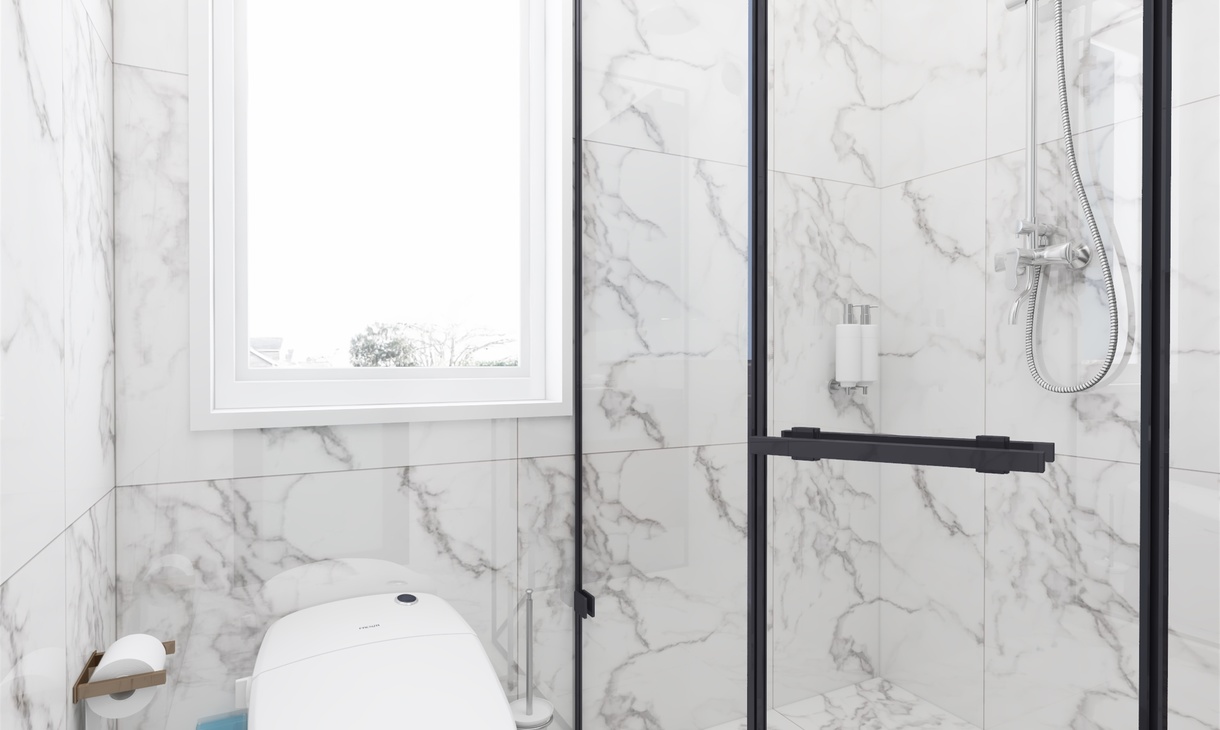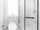 公卫墙面沿用贯穿住宅的雪花白,通透明亮。利用转角空间做玻璃隔断,干湿分离,保持卫生间的清爽。