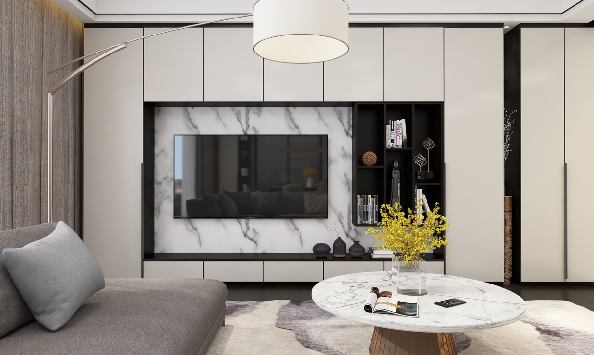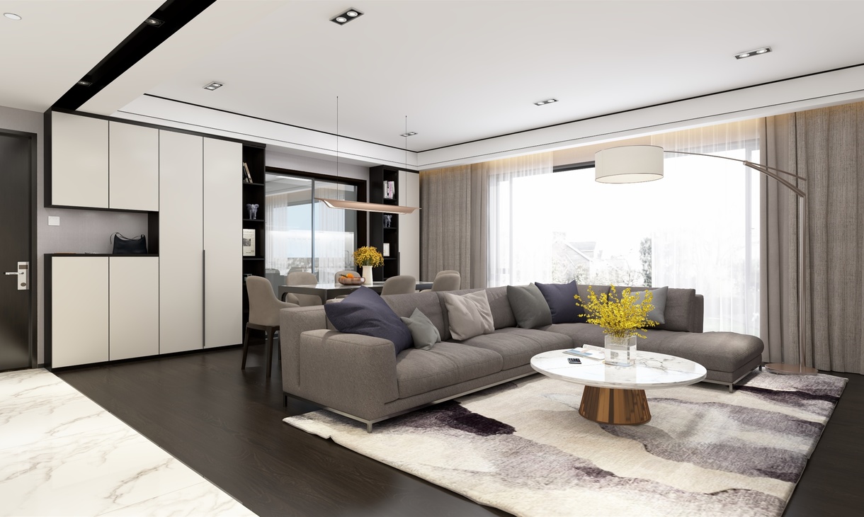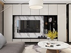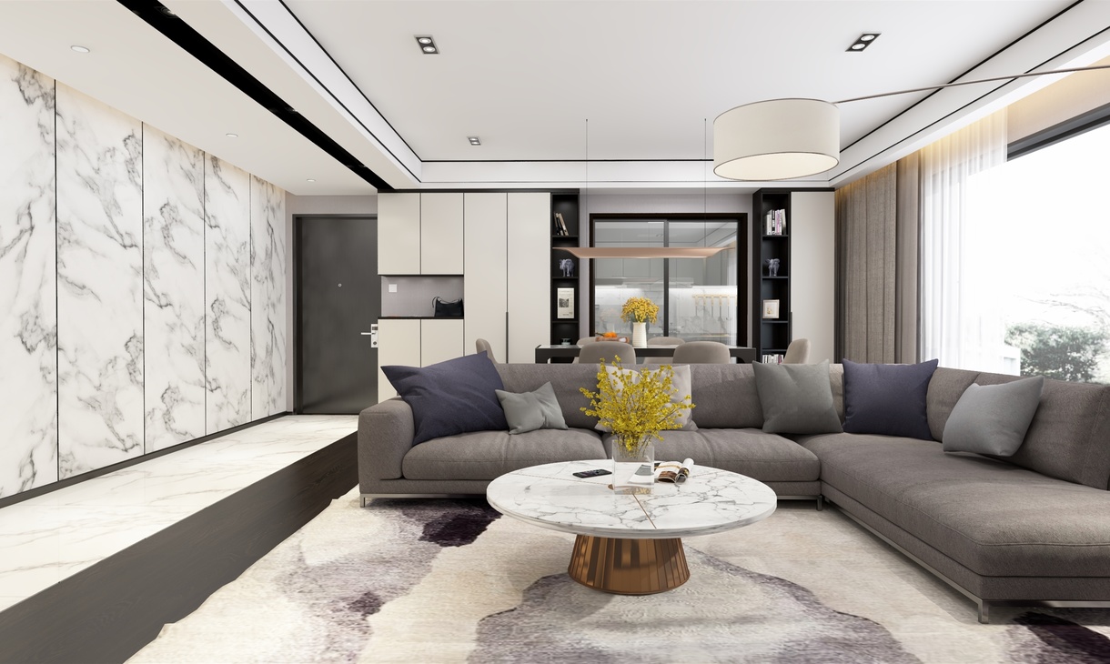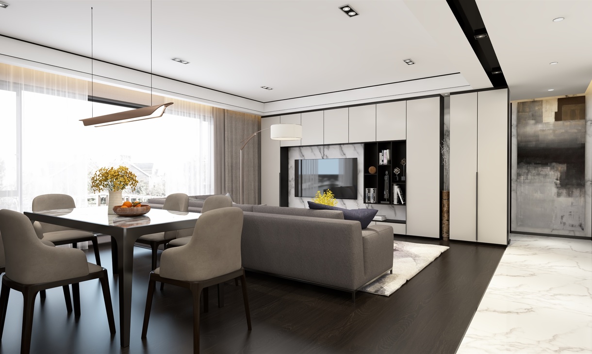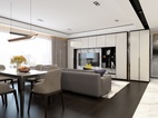 客餐厅的轴线关系、廊道的规整形态,整合了整个空间的秩序。 顶地面的关系处理,无形将空间功能划分,功能区之间组织合理的交通流线。住宅由石材、木材和乳胶漆共同营造出舒适而精致的氛围。空间中主次分明,整个空间以黑白为主色调。整面的到顶的柜体设计,适度的开放格展示,打造出舒适宜人的空间氛围。