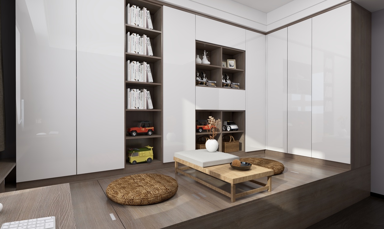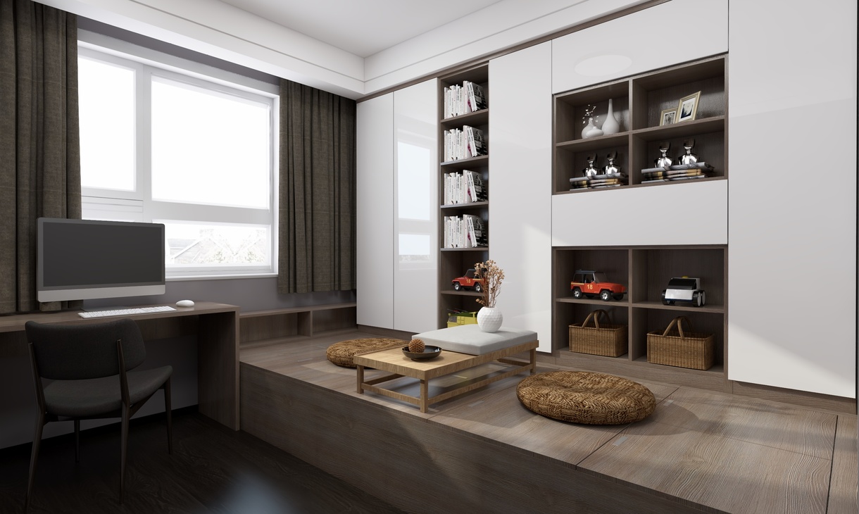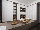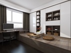书房作为一个多功能房,及会友娱乐,阅读,休息,储物与一身。木质机理的柜体搭配白色烤漆平板门,有序的开放格处理,哑光实木地板让空间更加亲肤舒适,整个空间素雅自然。