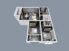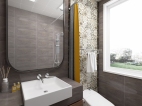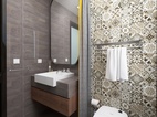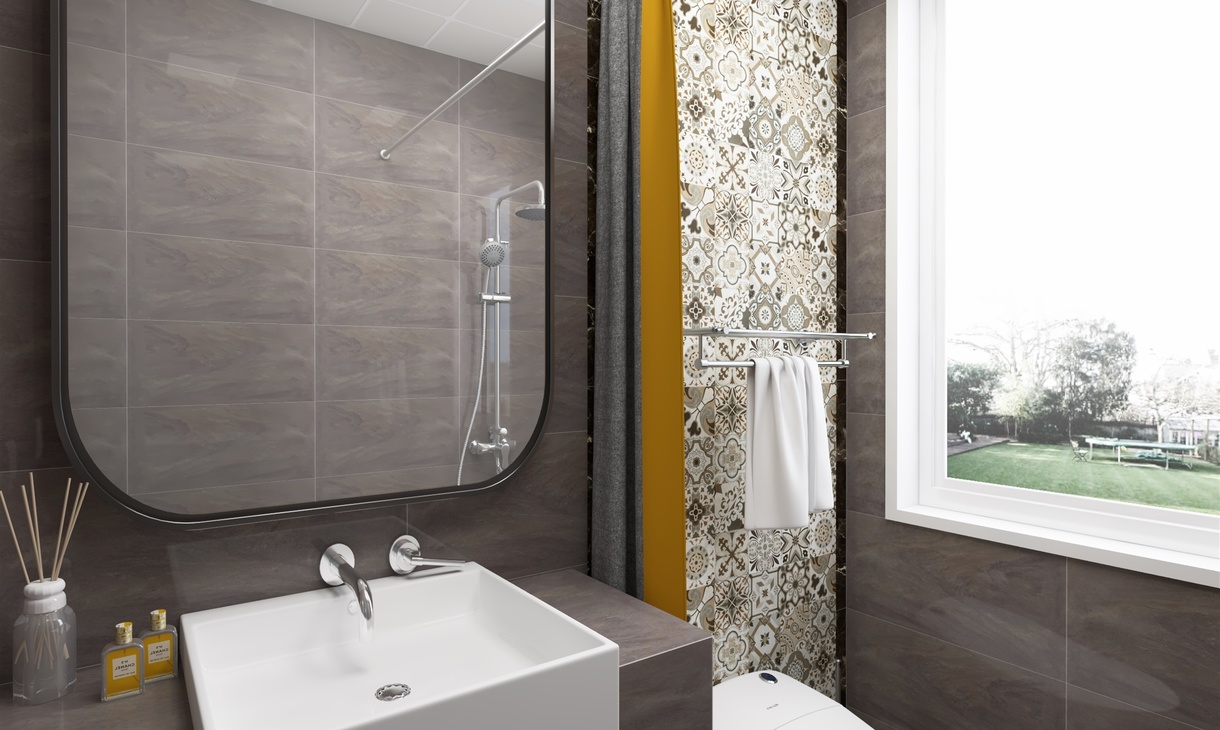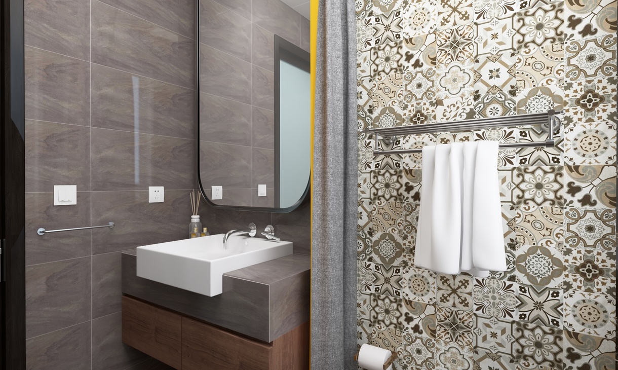 主卫空间狭小,墙地面采用花片和波打线做功能划分,浴帘和挡水石做干湿分离的处理,尽可能干湿分离。