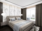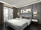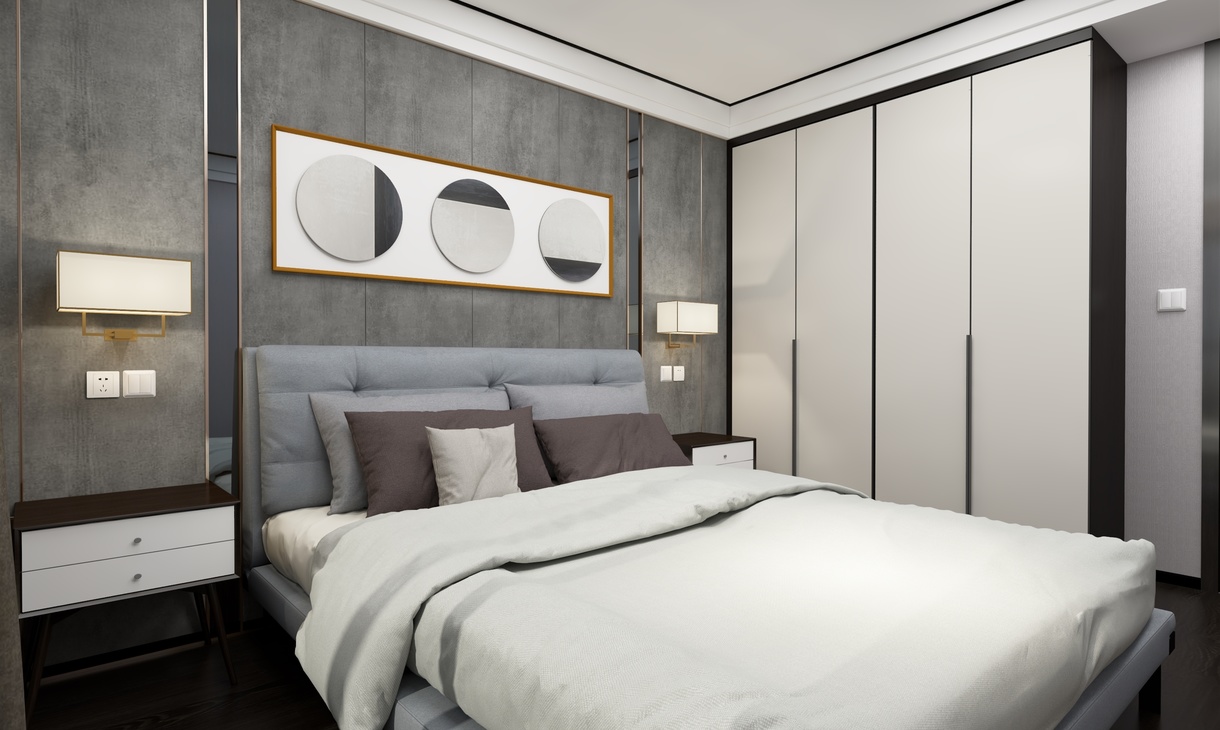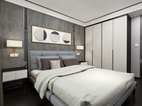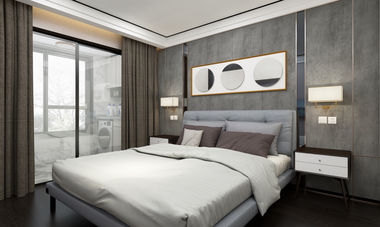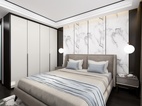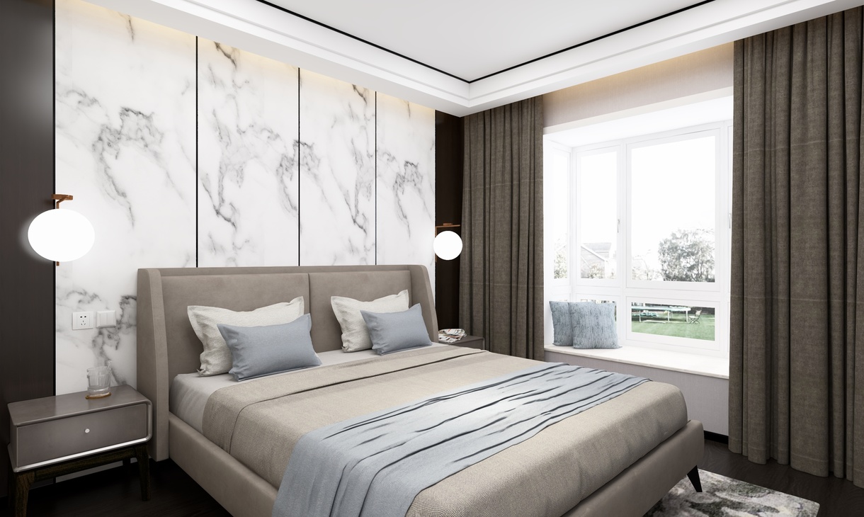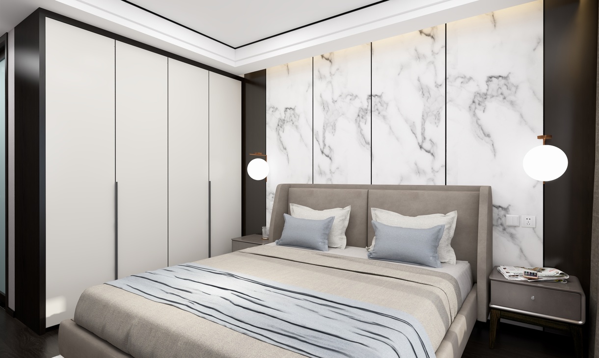 主卧背景墙采用石材和木饰面组合,通体的玻璃门大衣柜提升整个空间的气质。采用间接照明的灯带,更加柔和。搭配带有金属光泽的壁灯,营造出舒适而精致的氛围。