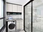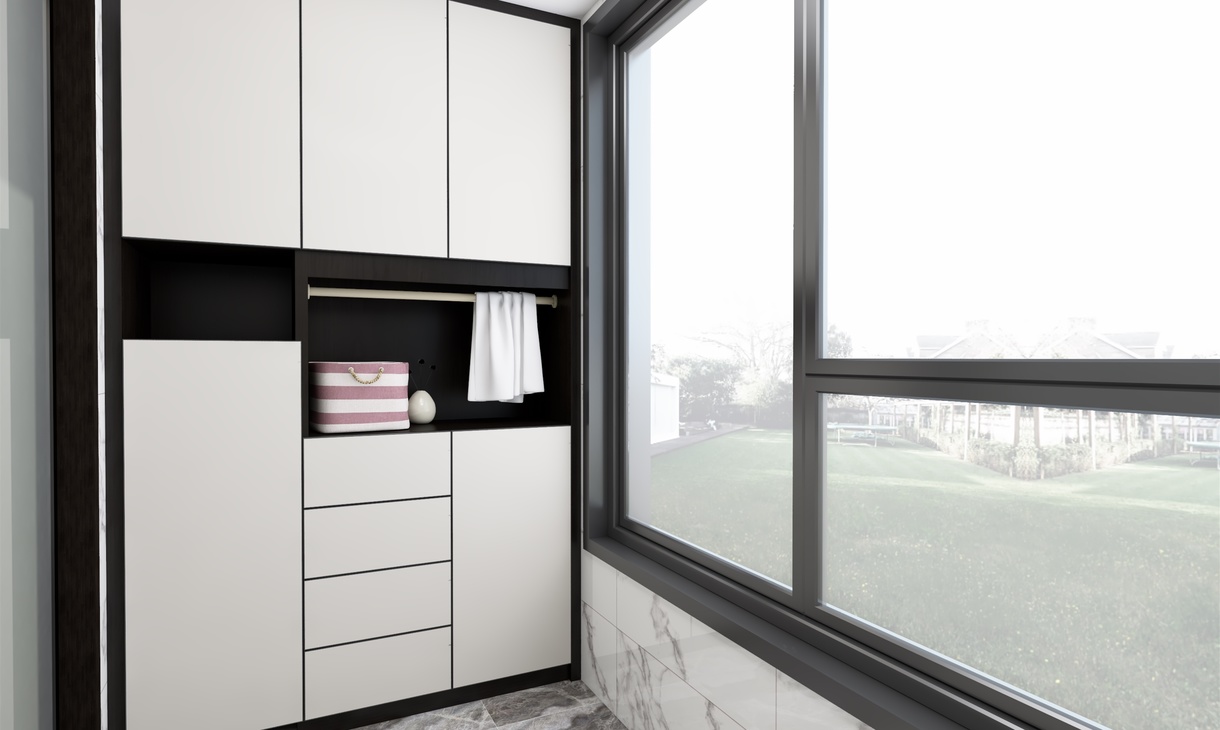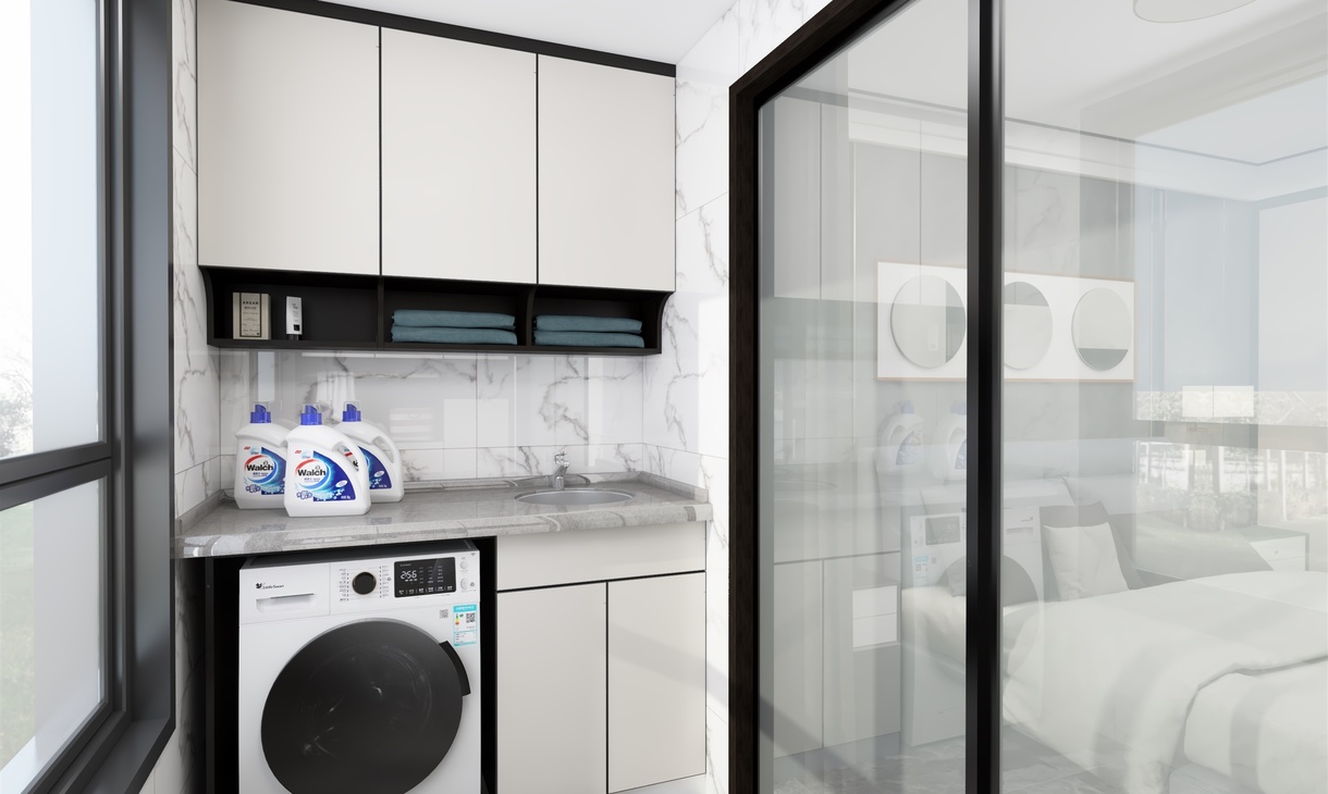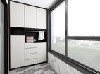 阳台墙面沿用贯穿住宅的雪花白,与柜体的黑木纹形成黑白对比。左边的收纳柜,将拖把等清洁物品有序的收纳其中。右侧的洗衣柜,简单的收纳满足日常使用需求。