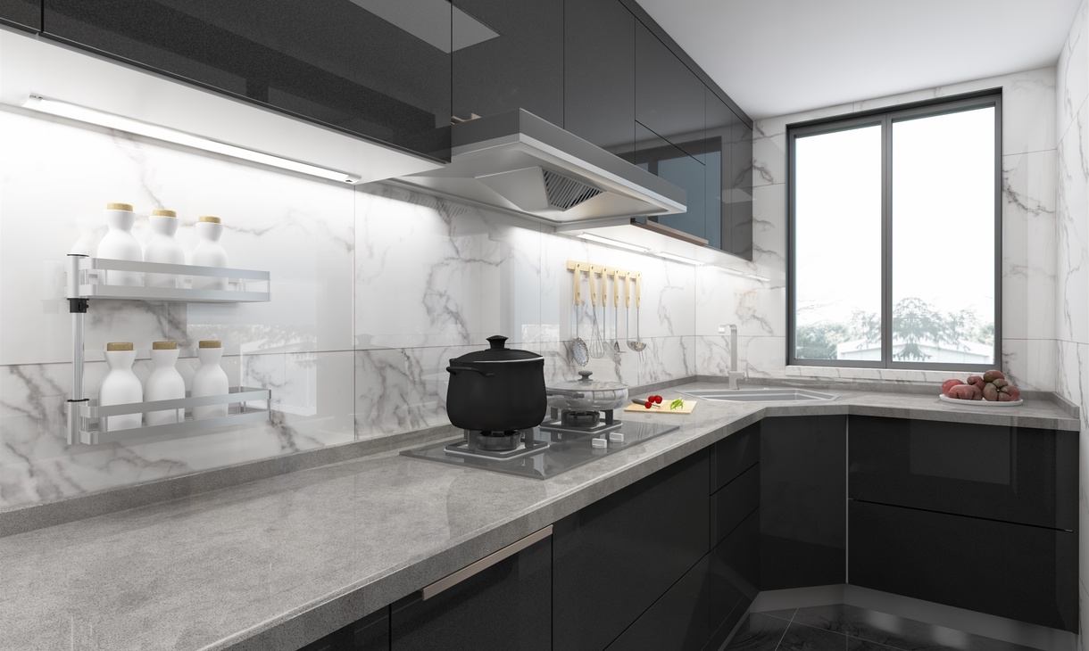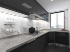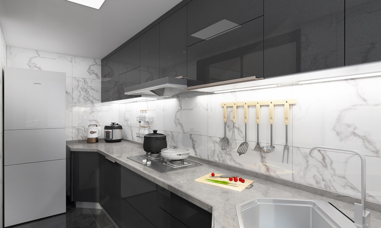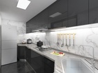 厨房墙面仿雪花白瓷砖铺贴,延续了整个空间的色调。厨房合理利用五区分布,动线不迂回,地柜多采用抽屉柜,提高使用频率。壁柜系统和灯光系统的加入,使得厨房更加人性化。