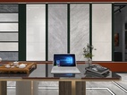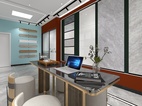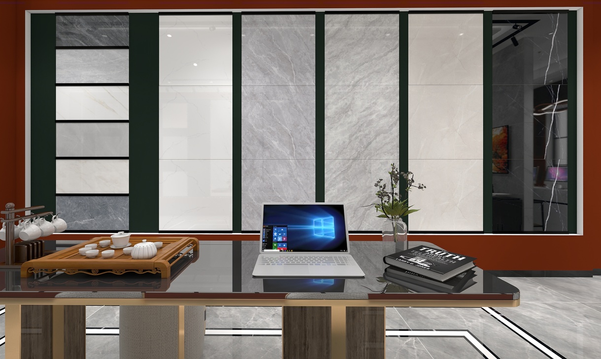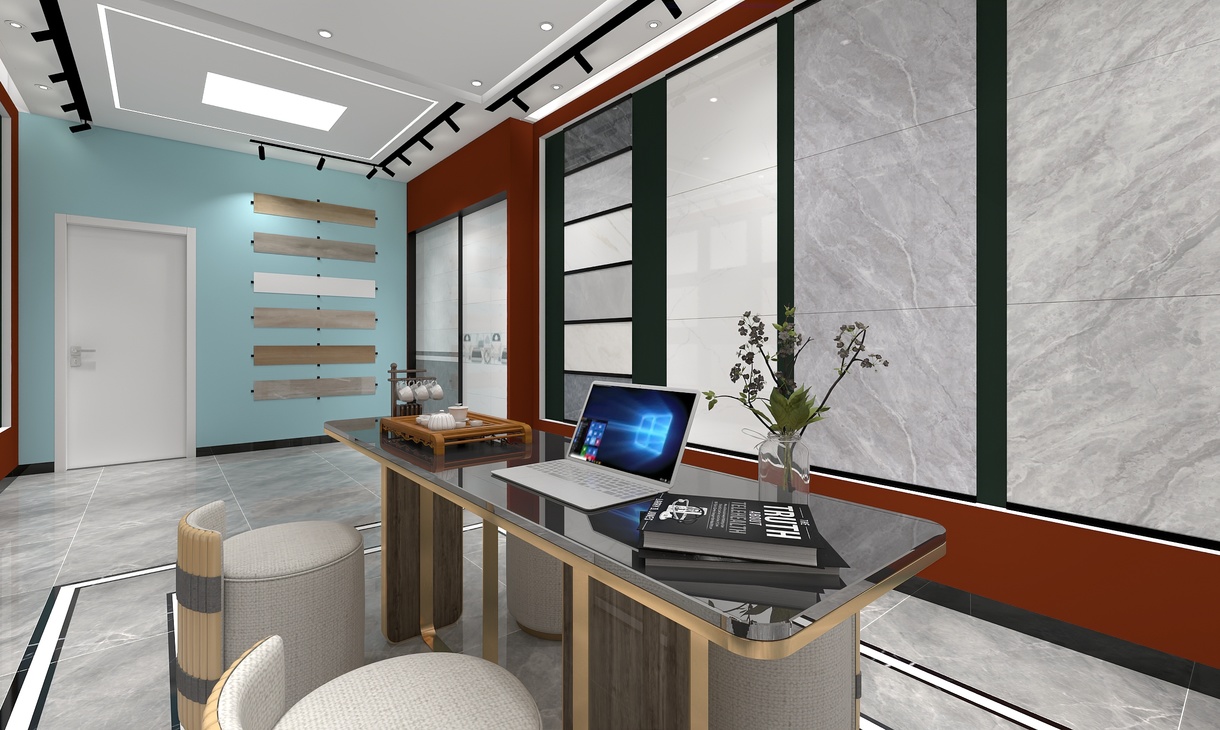 一字型户型,因为是瓷砖展厅需要规划多款产品,所以把洽谈区放在展厅中间方便产品对比,二添加一个小前台来展示连纹砖的产品和大板,墙面用了比较重的色彩,墙地黑白色过渡来突出砖的色彩。