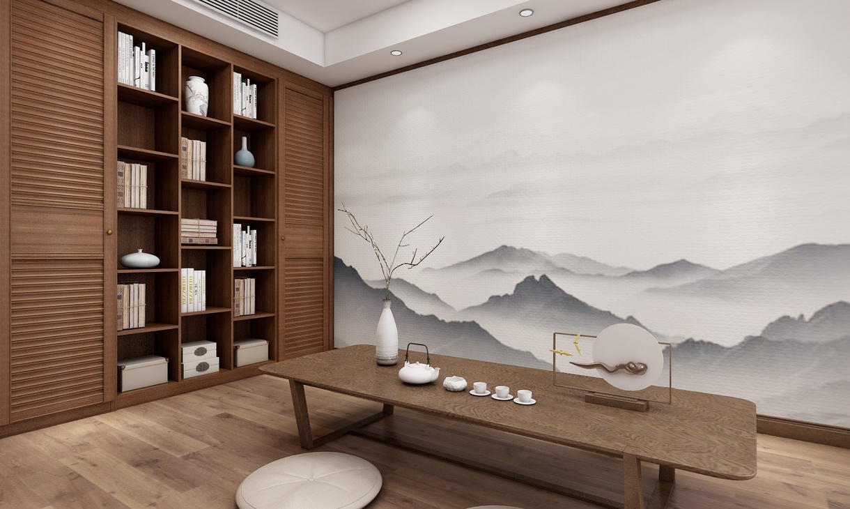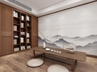 书房可供主人独立办公使用,工作之余亦可作画弹琴。大面积的半开放式书柜可收藏大量书籍,也可展示古玩摆件。或者可用作会客厅和茶室使用,一圈人围着矮桌席地而坐,品一壶好茶,谈一方天地。