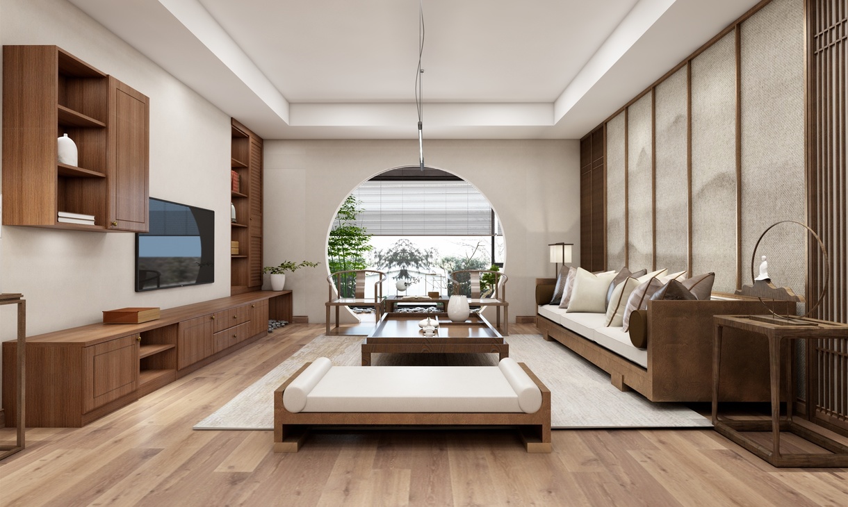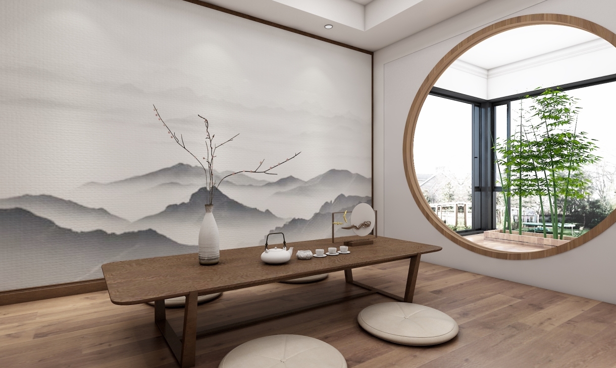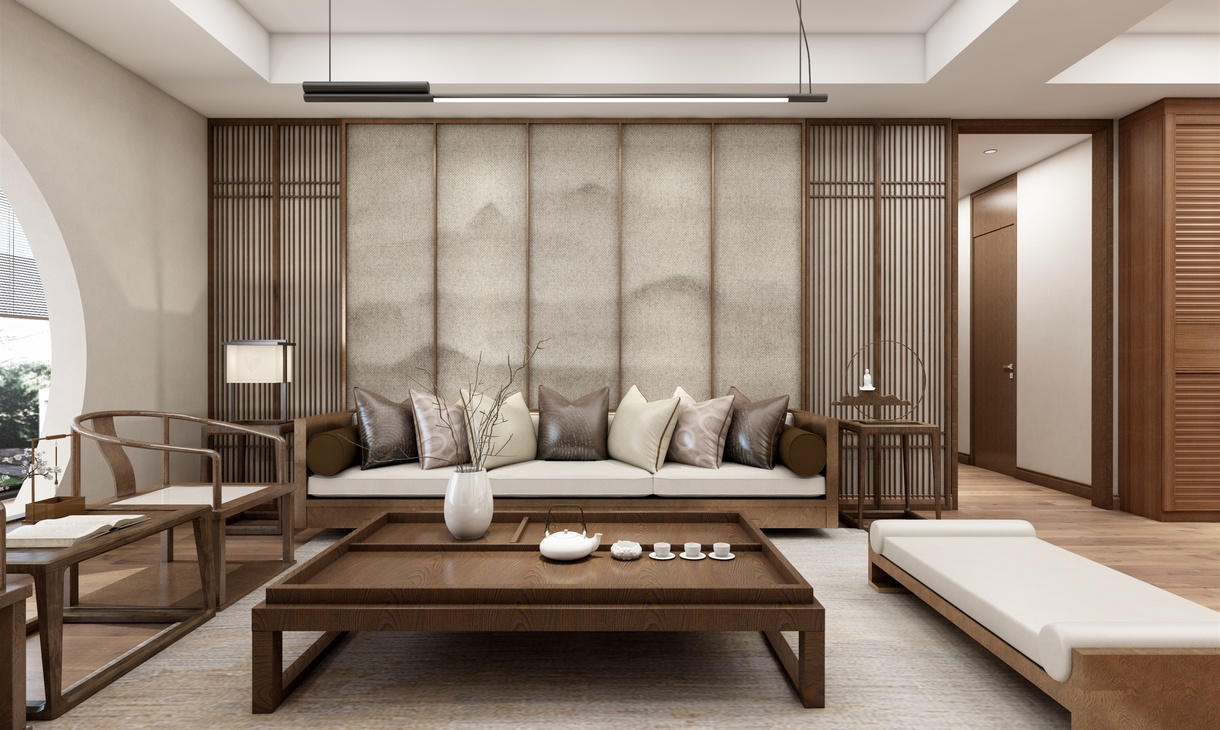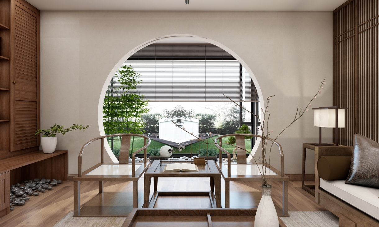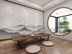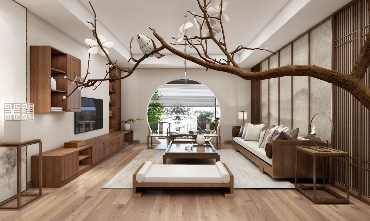 客厅设计一组半开放式电视柜,沙发茶几为简约的中式造型。山水画的背景墙面和木栅格的造型,虚实融合,与电视柜相呼应。阳光透过拱门洒在地上,与喧嚣一尺之隔,却恍如世外桃源,坐看流年春秋,尽享四时更迭,千年辗转,百岁光阴,尽在这厅堂之中。