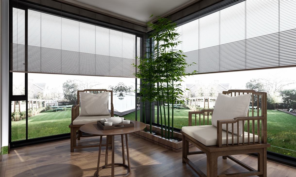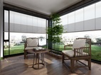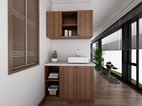 阳台分为观景休闲区和洗晒区,洗衣柜可收纳洗护用品。另一边闲暇会客时可在摇椅上品茶观景,摆弄花草,阳光透过玻璃窗洒在地板上,身长,惬意的时光恍若置身世外桃源。