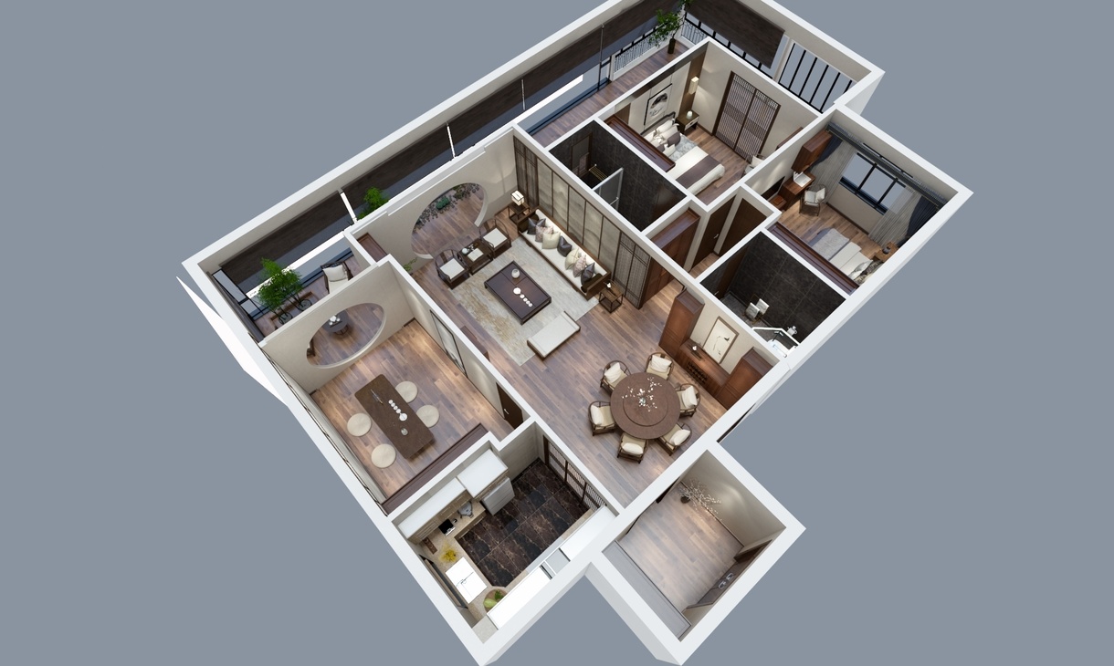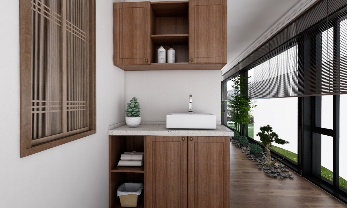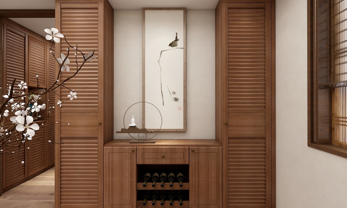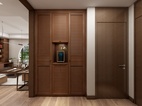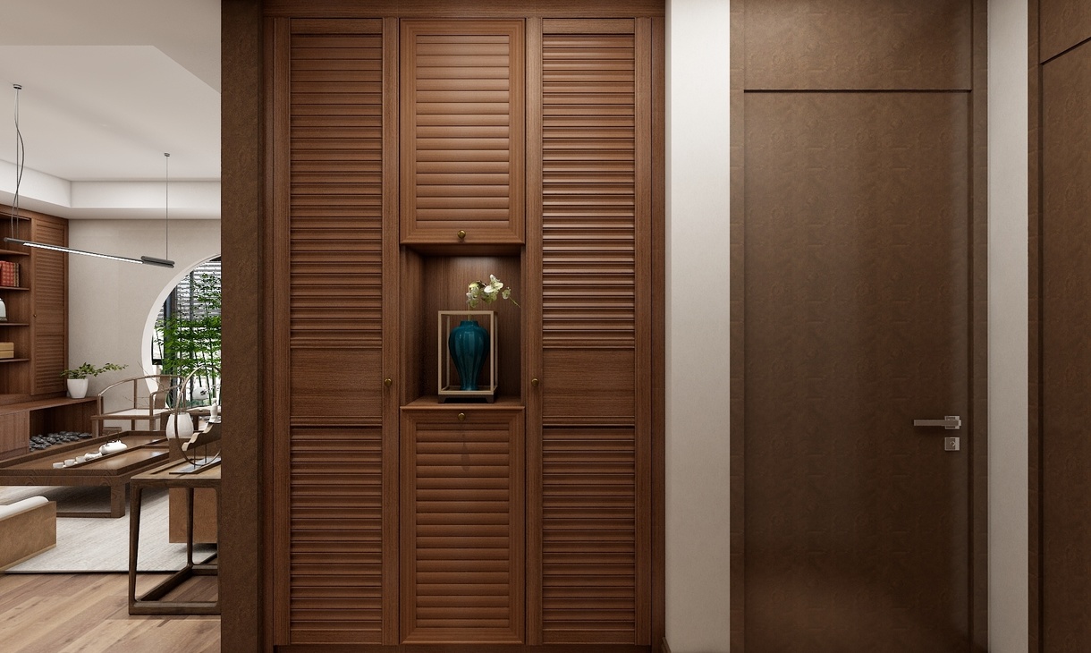 方案为三室两厅的户型,户主为三口之家,喜爱中式风格。 设计亮点:两个卧室分别为男女主人和少年的卧房。另外一个卧室改成书房或者茶室。方便独立办公和会客。阳台既做了洗晒区又有休闲区。方案追求在精神气息的沛然奔放中与自然亲昵无隙的融合,以鲜明浓厚的艺术文化与多元化的创意相结合,空间中富有着生命的气息,流动的空气与自然的景色结合,设计出极具创意感的设计表达,人文艺术与野性自然浑融无间。 采用木色的柜体,与简约的中式风格软装相结合,拱门圆椅象征团圆之意,一花一草充满灵气。浅色墙面搭配深色家具,空间层次分明不失稳重优雅。延脉传统中式的神韵,整体空间简约而稳重。