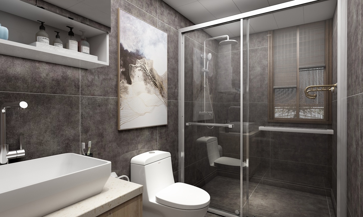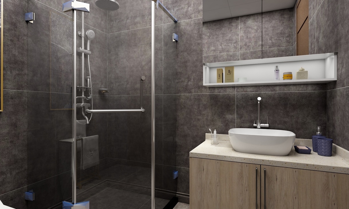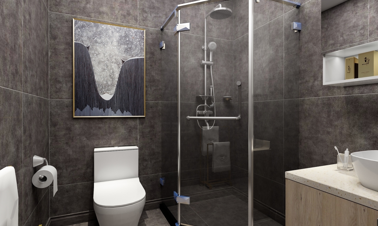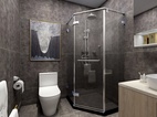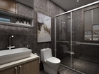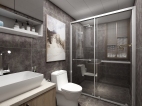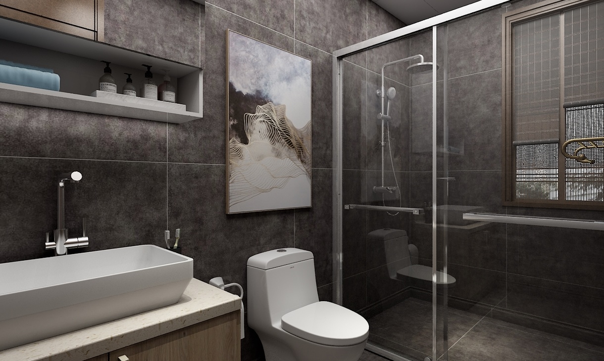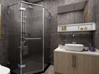 此卫生间为主卫。设计了方型的淋浴间和一组卫浴柜,卫浴柜为上下形式,吊柜采用镜面柜的设计,既满足打理妆容的需求也可收纳洗漱用品,药品等杂物。深色的墙地面营造出放松舒适的洗浴空间。