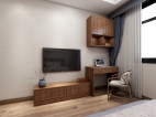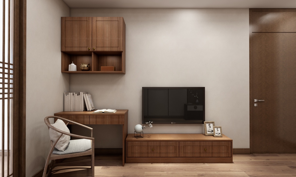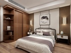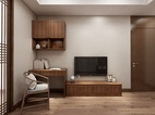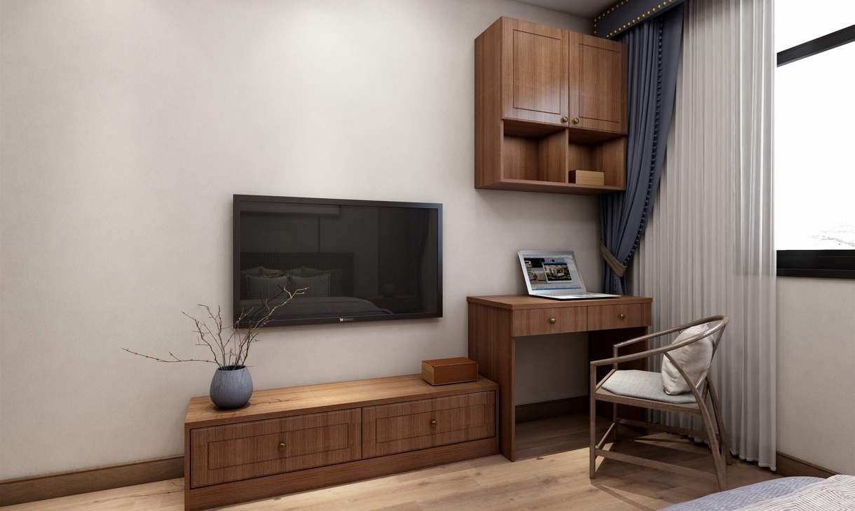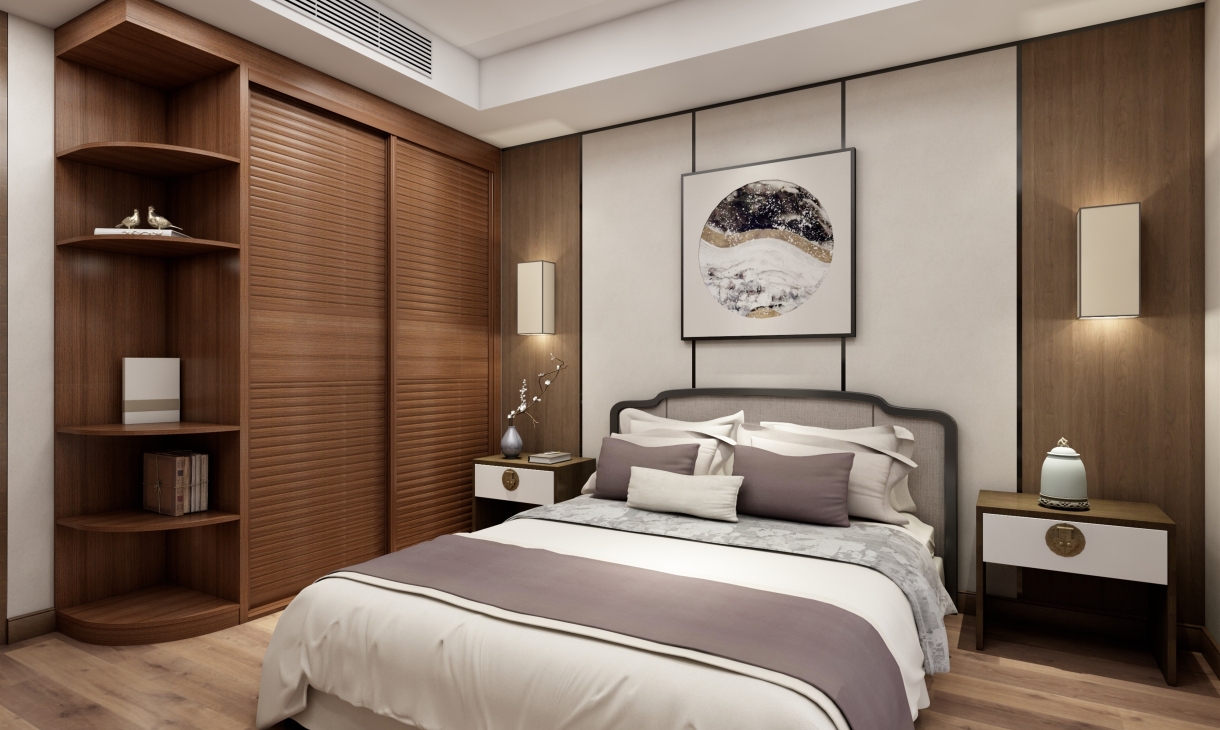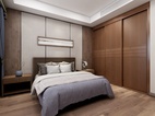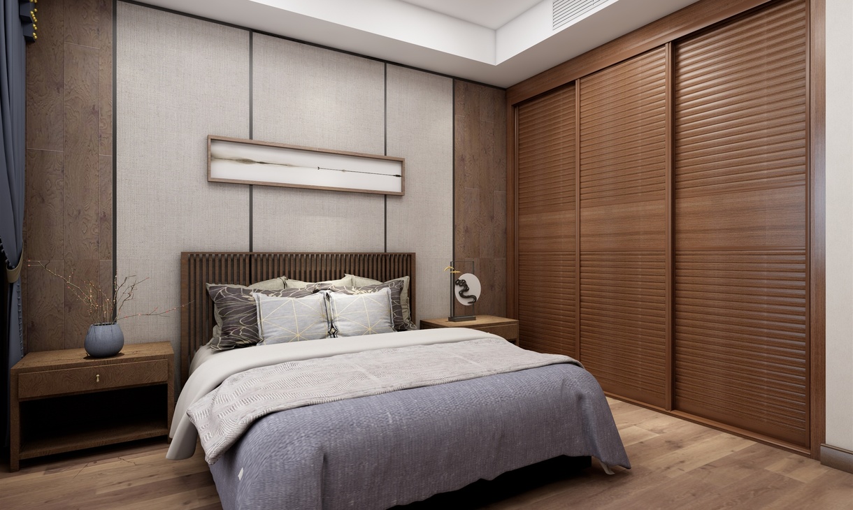 主卧为男女主人的卧房。衣柜采用移门和转角柜的设计,可容纳大量衣物被褥。电视矮柜和书桌柜的组合形式让柜体整体统一,即可办公也可作为女主的梳妆台使用。精致的中式的花瓶,挂画,灯具凸显主人持重而温文的性格和品位。木色的背景墙还原自然的气息,灰色调的米色和浅紫色的床单充满雅致与舒心,营造出放松和温馨的就寝空间。
