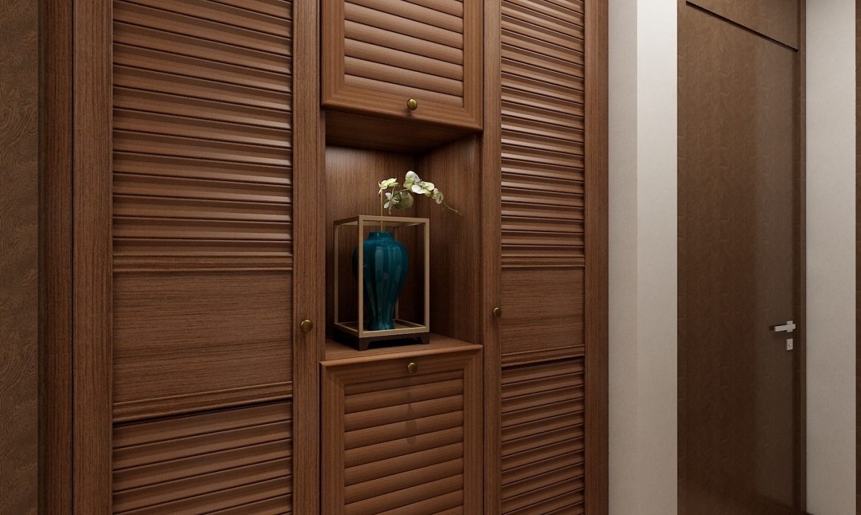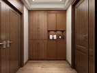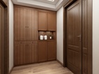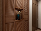 过道为通往次卧主卧的区域,左侧墙面将卫生间一侧空间缩小,靠外做一组内嵌式高柜,可放置卧室内放置不了的换季鞋帽被褥,增加收纳空间。中间镂空的设计可放置花卉工艺品,收纳造型两不误。