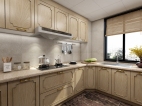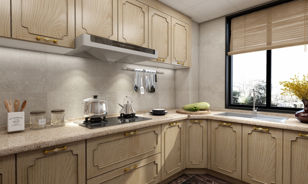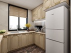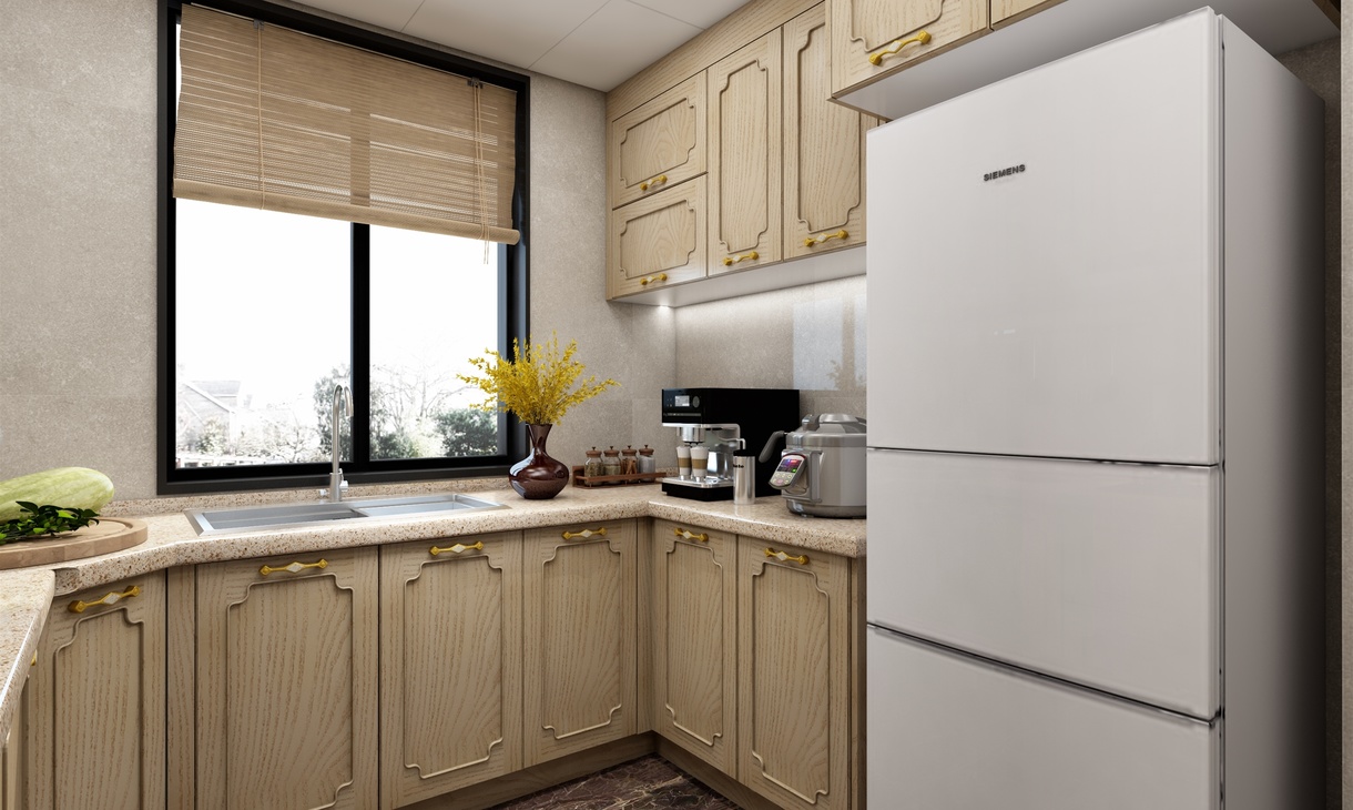 厨房设计为L型的橱柜。吊柜和地柜不同功能的柜体可收纳各种厨房用具。 让忙碌的厨房不再凌乱。洗切烧的合理分配让厨房动作一气呵成。美好的心情中做出可口有爱的饭菜。