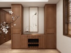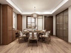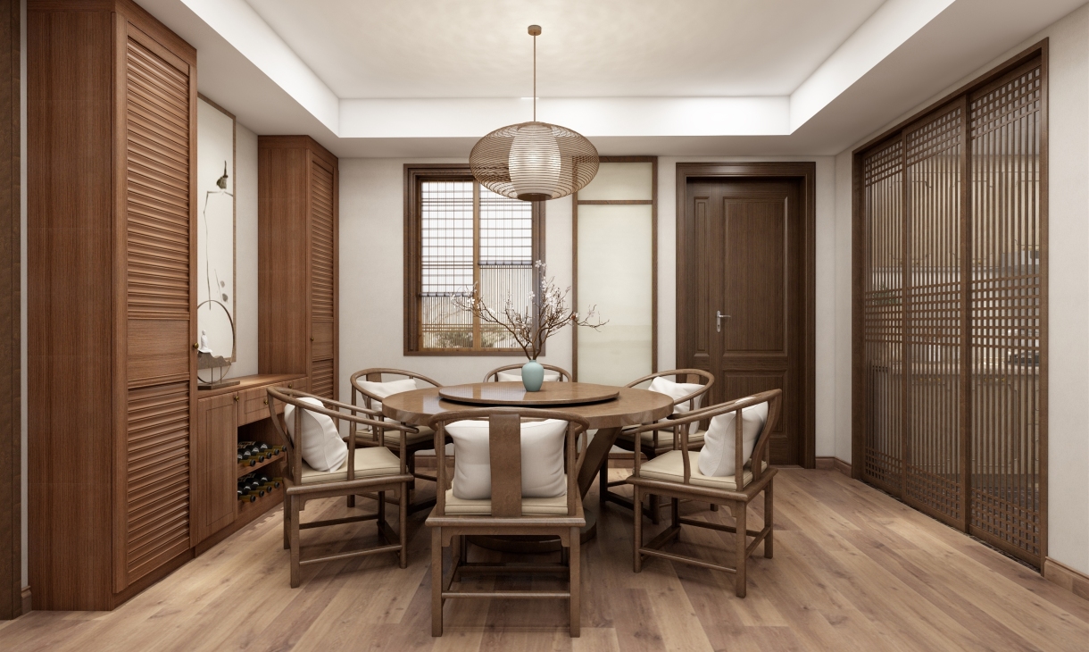 餐厅餐柜分为高柜和矮柜,为中式元素的对称造型,可放置茶碗食品和也有藏酒区。圆桌可供一家人和常客用餐使用。中式简约造型的鸟笼吊灯,弧型座椅,东方的娴静气韵,将中式的内敛含蓄,以现代手法勾勒重现。花枝斜逸中,暗香疏影,美味缥缈间,温婉清宁。