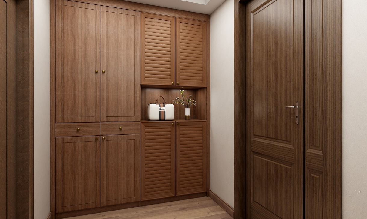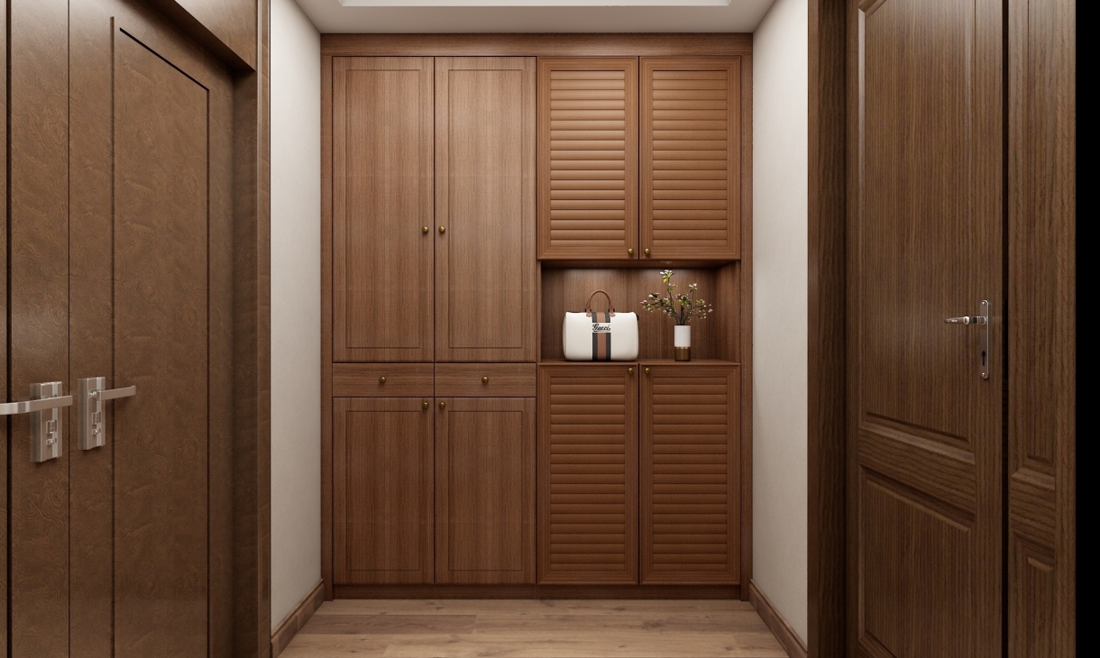 入户设计一组高柜,可放置大量鞋子,开放格可放置随手包包和购物袋,方便换鞋。
