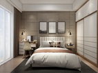 主卧多以线条的结合运用,现代的皮革床搭配定制衣柜门板,在床头灯的照耀下,舒适中既温馨。