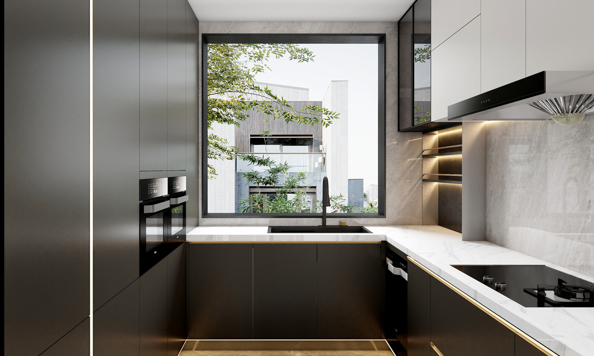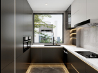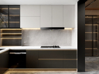 轻奢风格代表的是奢华有品位的厨房展现得淋漓尽致。厨房的整个橱柜采用了黑色,白色搭配,黑色的让人感觉厨房十分干净整洁。
