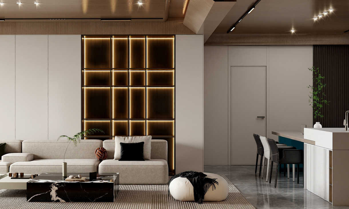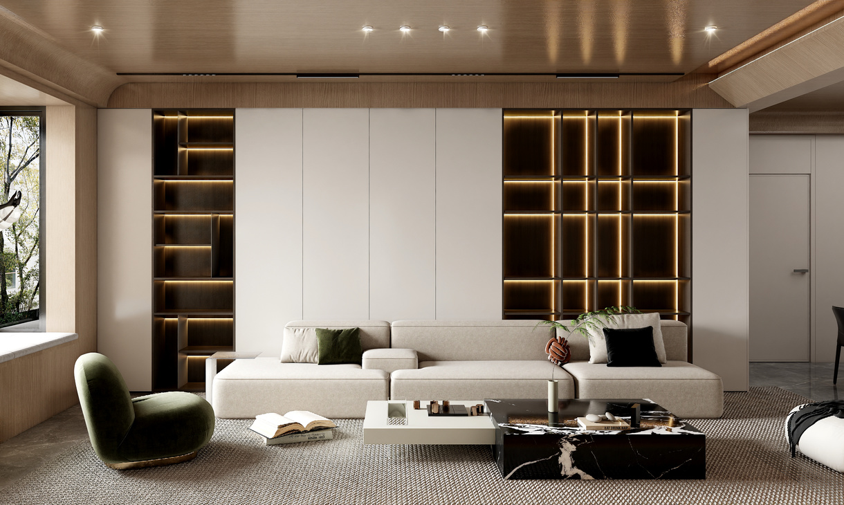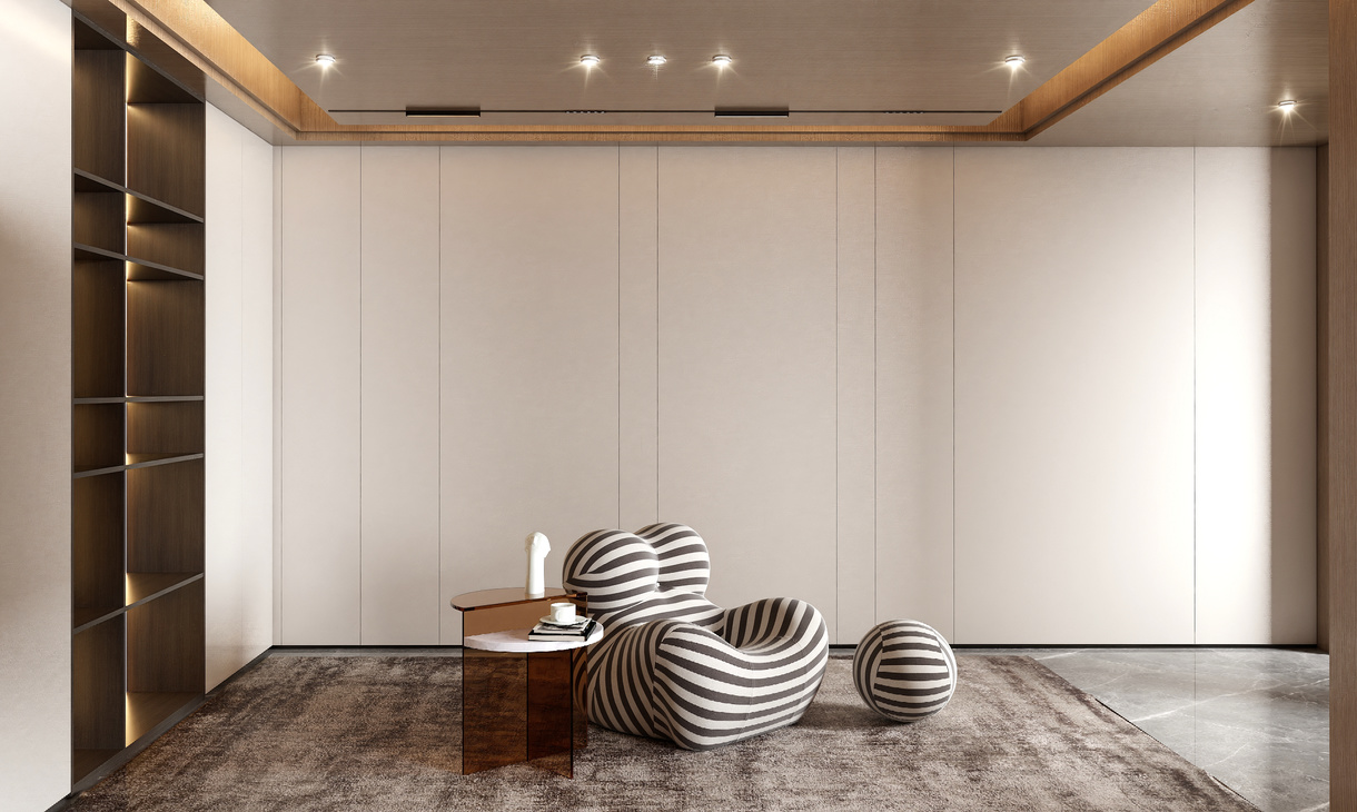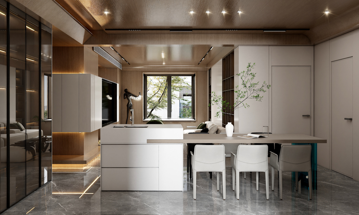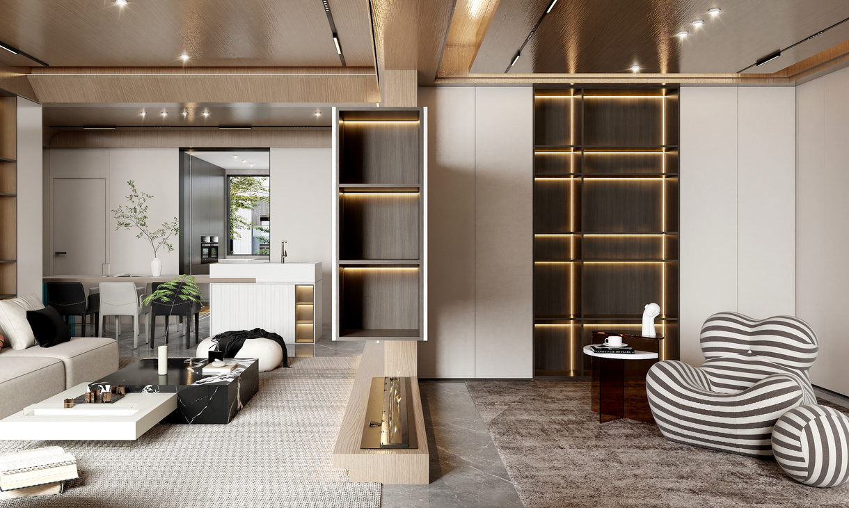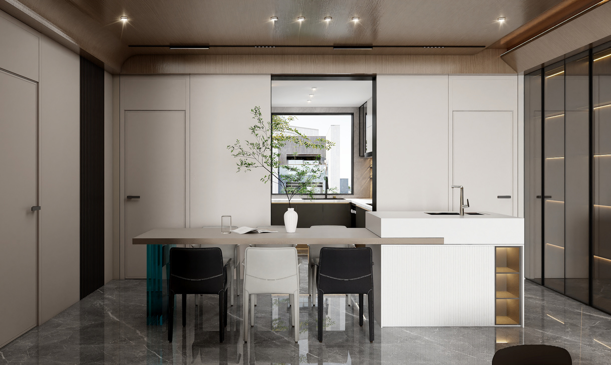 在客餐厅空间中,以陈设艺术品的穿插描绘出优雅情绪与极具张力的空间语言,细腻诠释着一个时髦轻奢诗意的舒适空间。