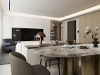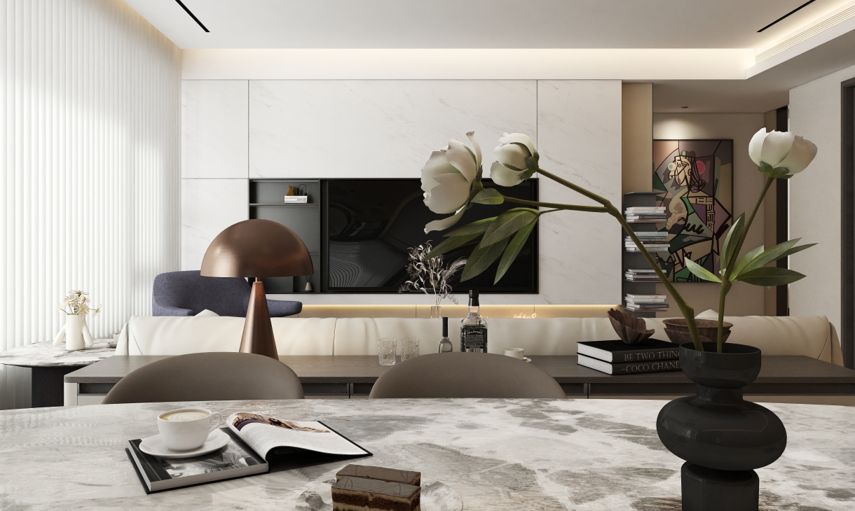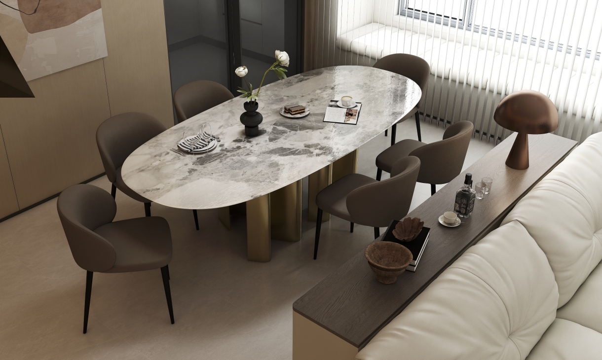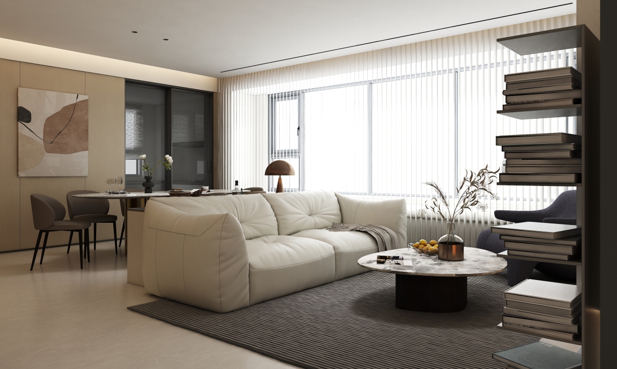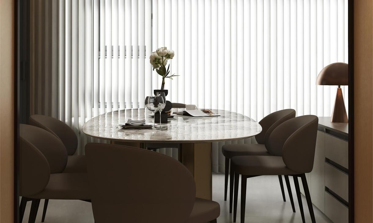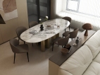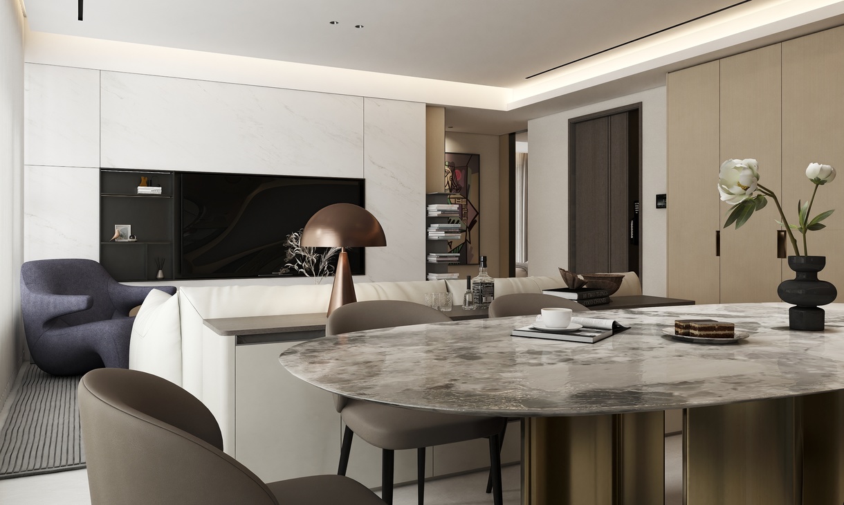 客厅采用STEEL-LAND糯米糍沙发和抱抱椅搭配,松弛感拉满,餐厅选用发纹香槟金腿海浪餐台,给整个空间提亮加分,软装部分无论是糯米糍沙发和抱抱椅的形态还是配色,都与装饰画和摆件做到融合呼应,空间内的颜色协调,令人愉悦。