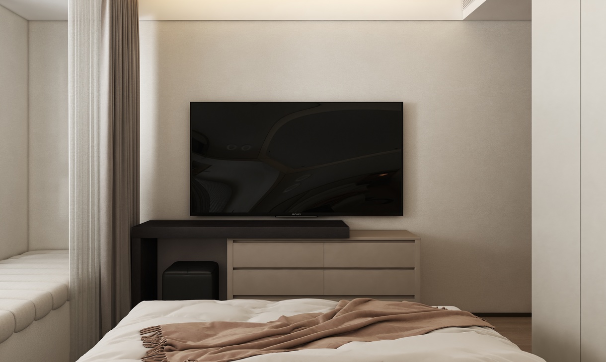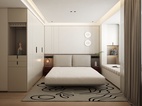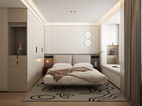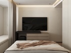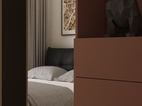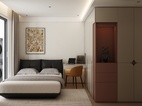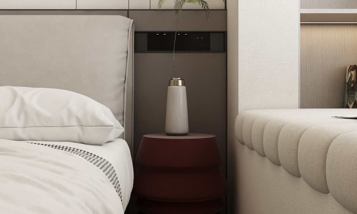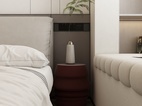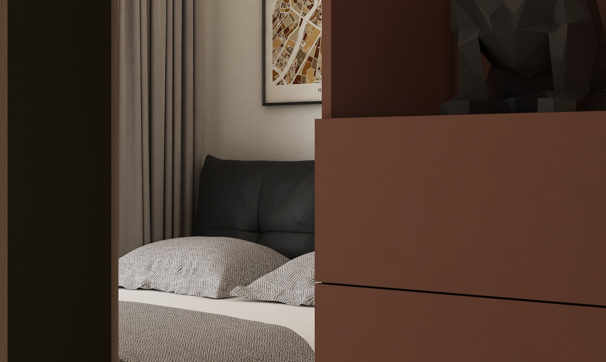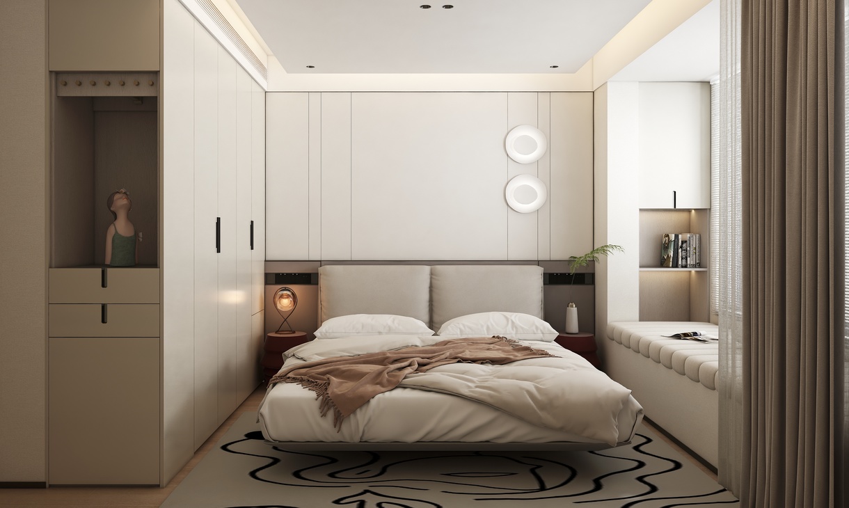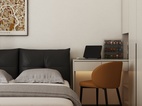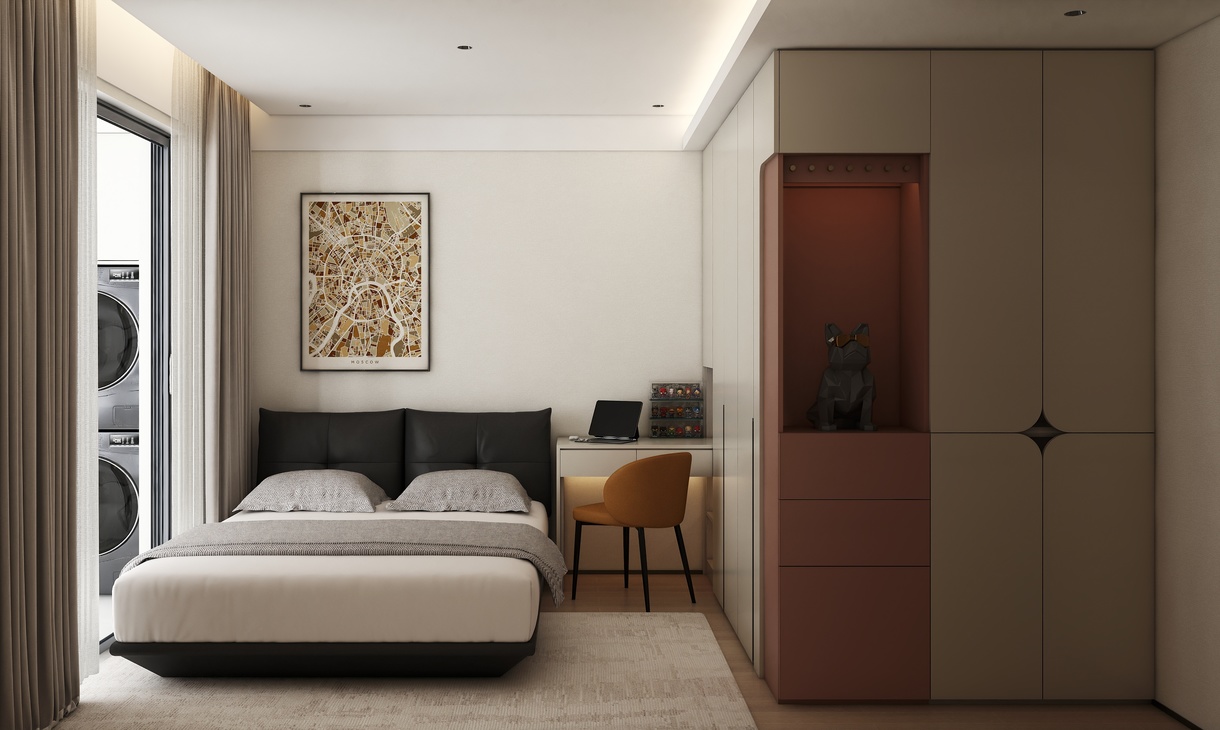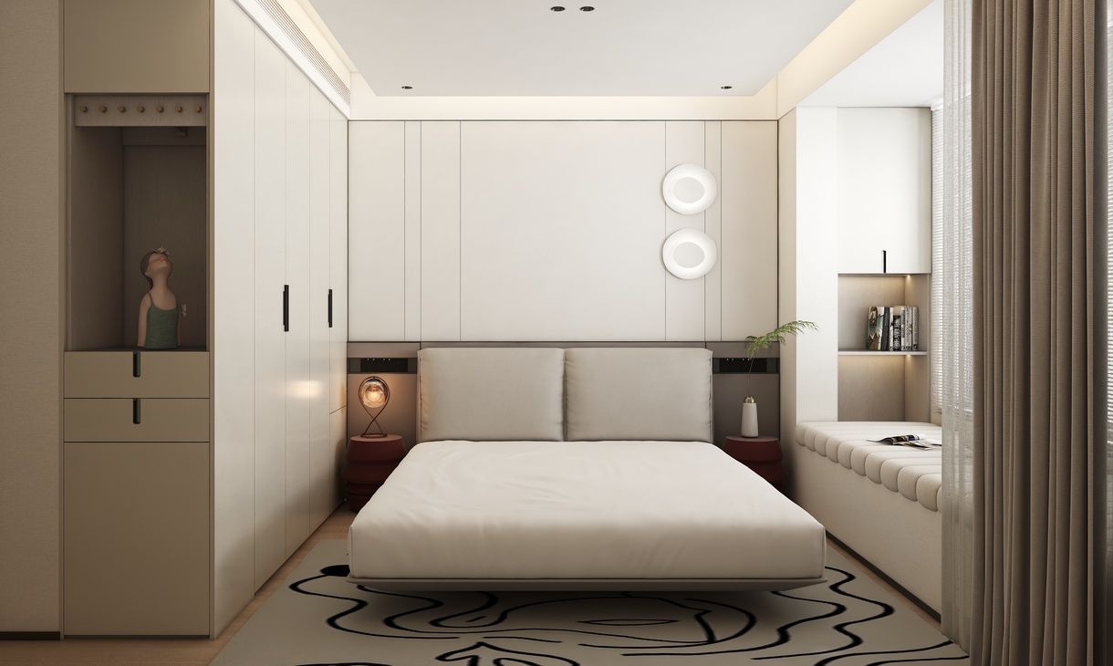 主卧充分利用的有限空间,搭配齐边悬浮小象耳朵床,在保证空间的情况下提供温馨舒适感,床头柜采用复活节岛石像造型,将客厅抽象画的情绪延伸至卧室,酒红色烤漆让每个夜晚都能微醺般舒眠。