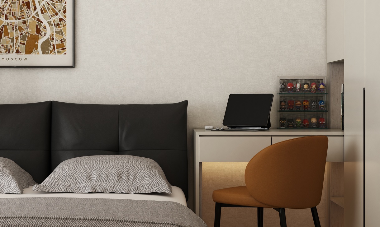 酷酷的男孩卧室,采用十字格设计主题,在没有多余空间给床头柜的情况下,更适合斯帝罗兰010床出场,暗藏玄机的羽绒靠包下,额外提供两个收纳空间,挂画和书椅颜色呼应,床和小狗音响颜色呼应,床头造型和衣柜门板造型呼应,让整个空间充满互动性。