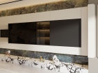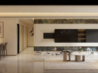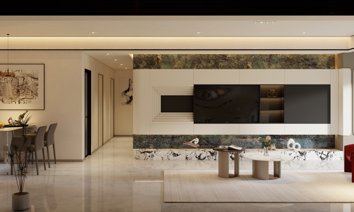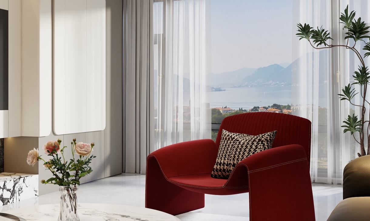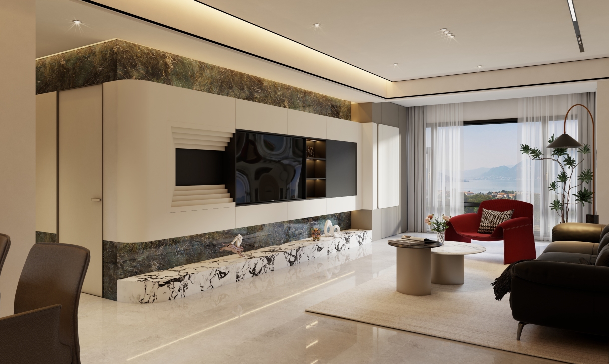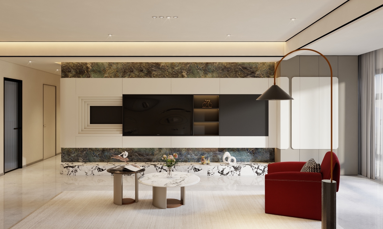 这间现代客厅设计融合了简洁的线条与舒适的色彩,突显出空间的通透感。选用自然的石材和光滑的地面,营造出温暖而优雅的氛围。清晰的布局让生活更加便利,红色沙发作为点缀,增添了一丝活力,使整个空间既时尚又不失温馨,完美体现了现代居家的理想生活方式。