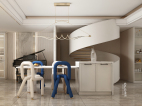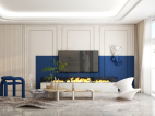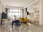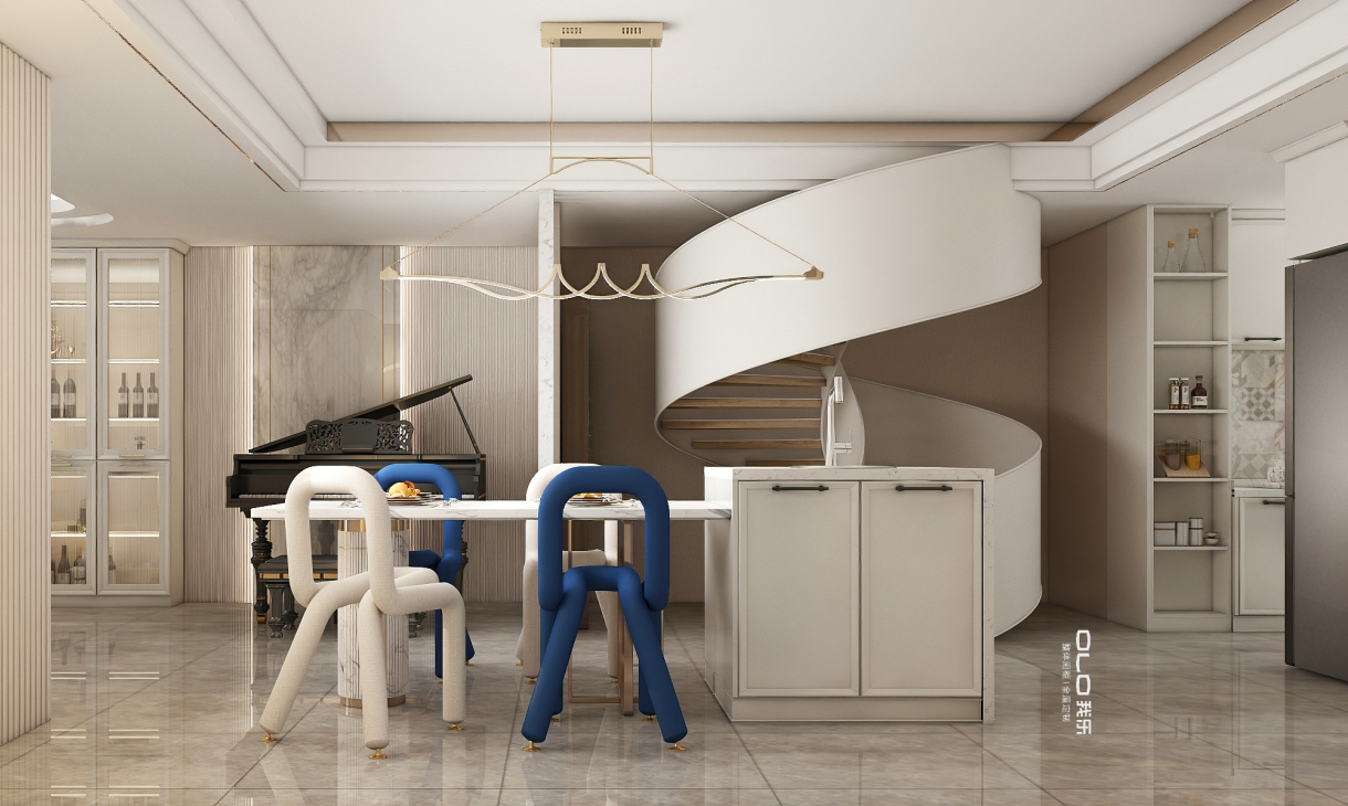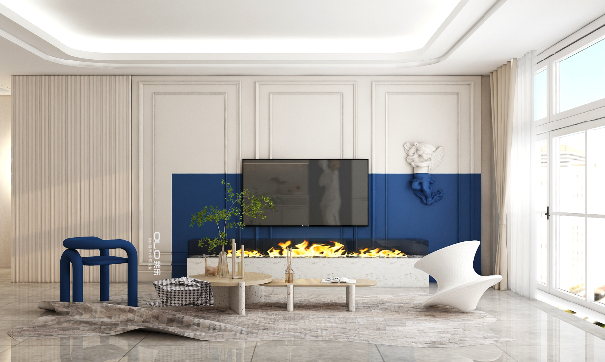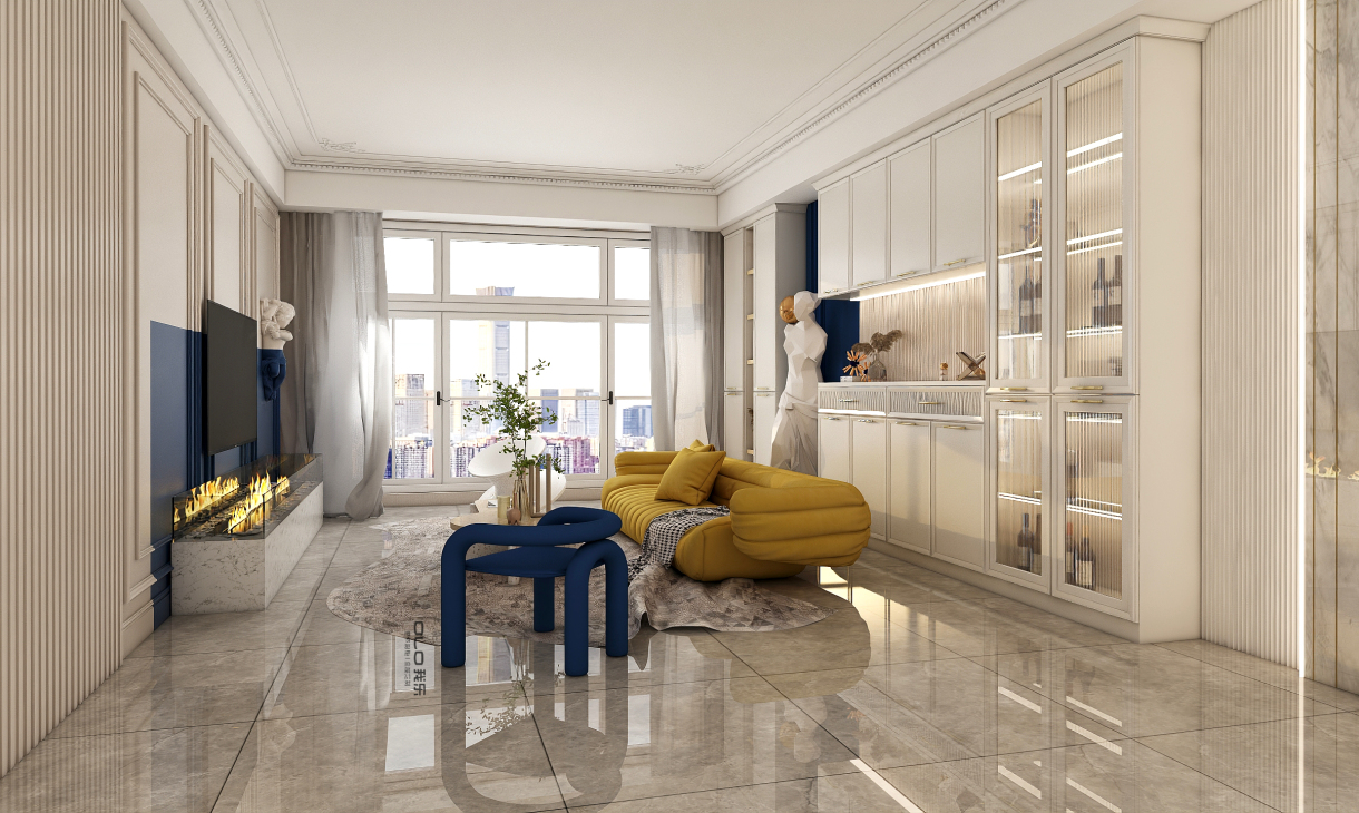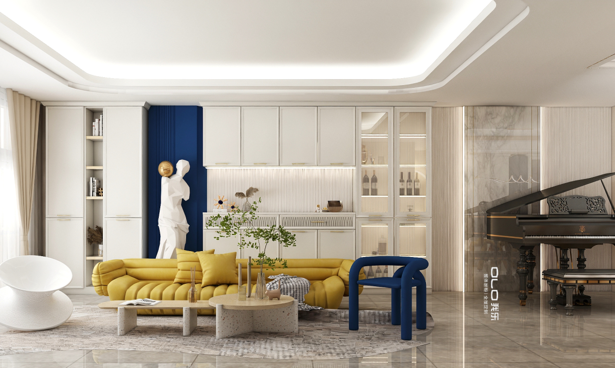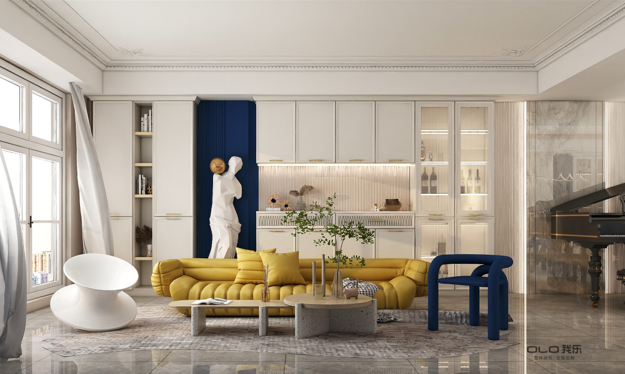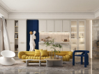 ▼蓝色与黄色的对比色,让整个空间极具冲击力,兼具法式弧形线条,弧形沙发茶几,大理石与金属的结合,赋予整个空间灵动。
