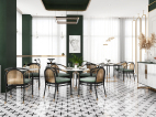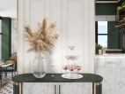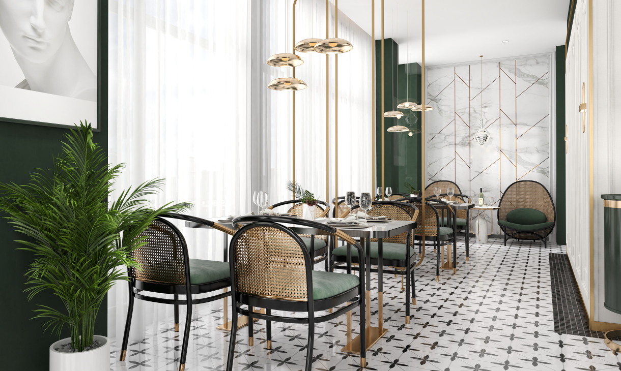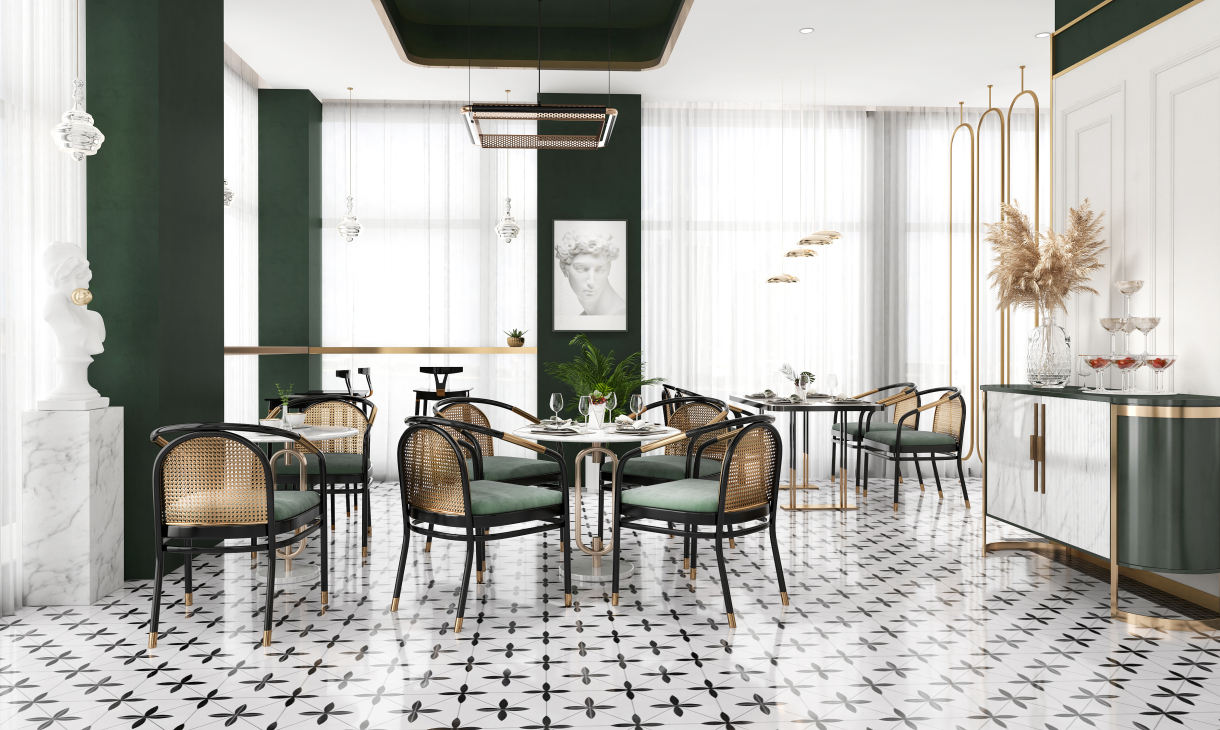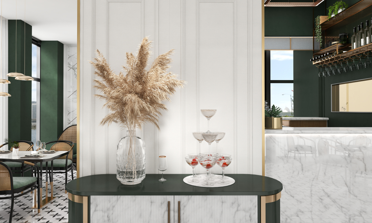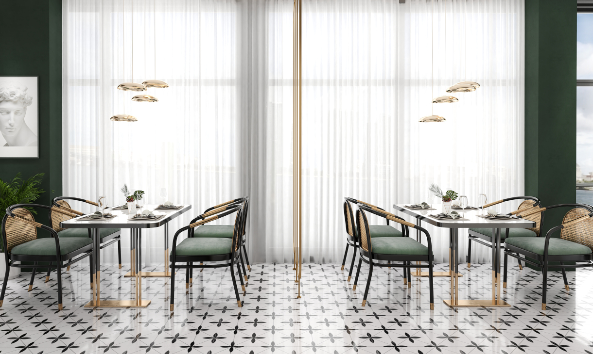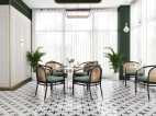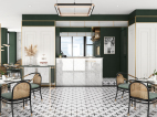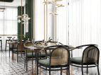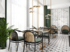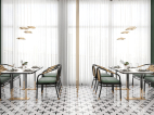 井然有序的造型护墙围绕吧台展开,几何画面地砖大面积序列铺展,深色马赛克修边,和软装陈设一起形成“有形”、“充实”、“秩序”的空间状态,随着视觉从仰视转为直视,整个空间形态就此转变。吊顶往上延伸的方洞,装饰灯具穿插其中,轻纱围绕四周,表现出“无形”、“虚”的存在,虚实结合,一起形成微妙的状态。让空间层次更为丰富