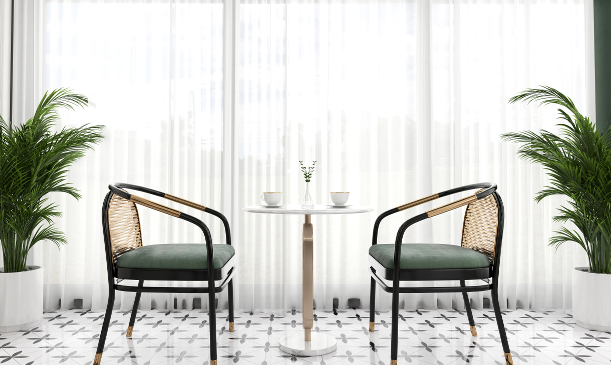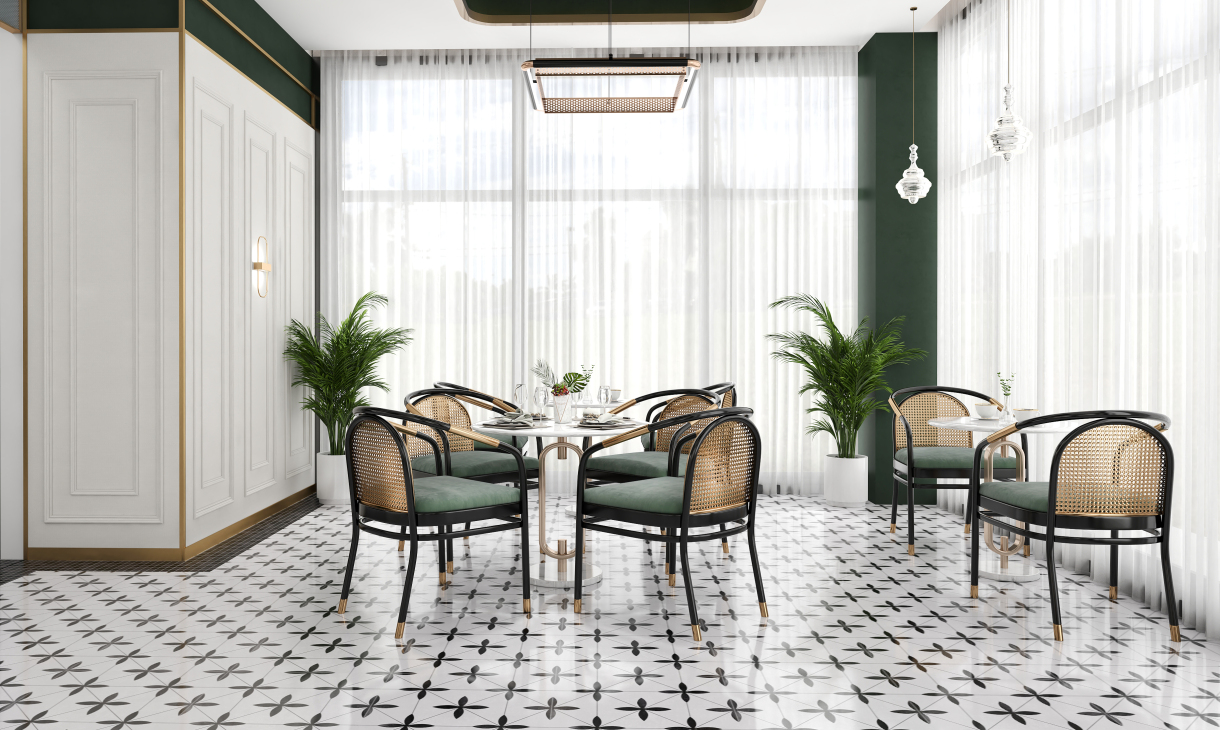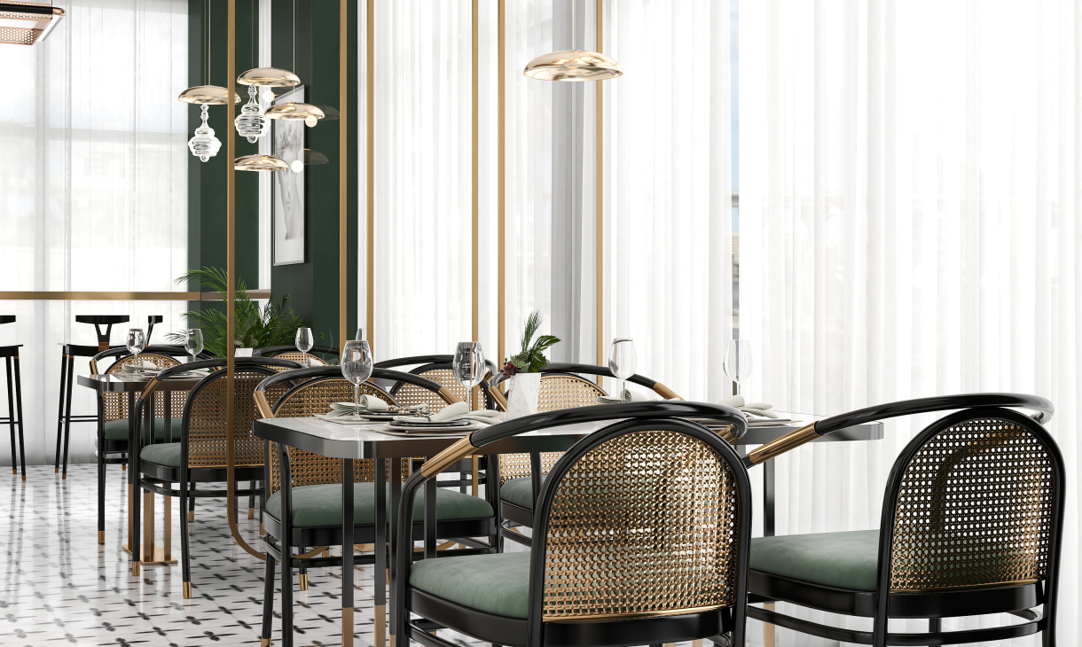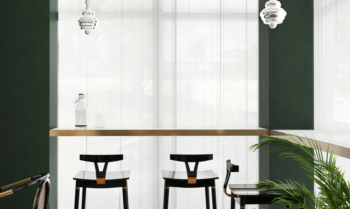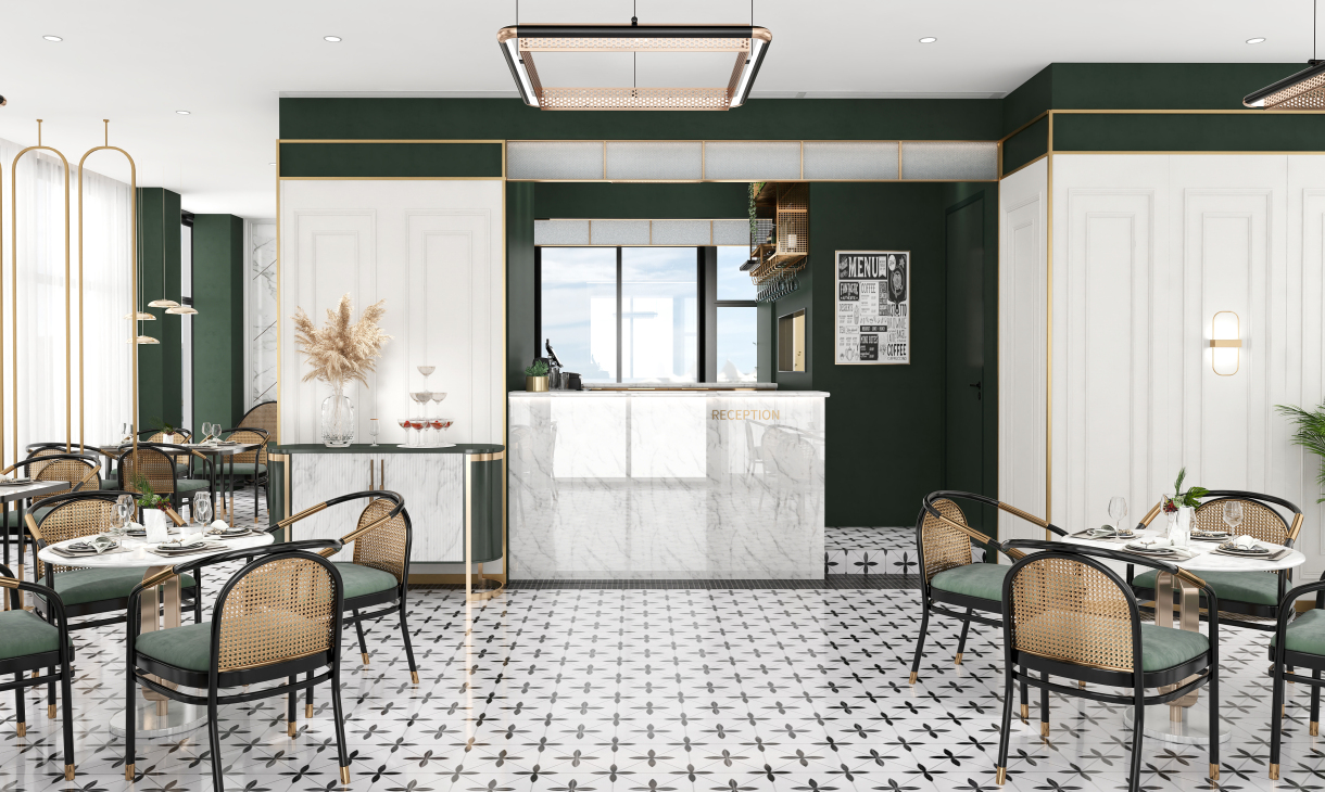 井然有序的造型护墙围绕吧台展开,几何画面地砖大面积序列铺展,深色马赛克修边,和软装陈设一起形成“有形”、“充实”、“秩序”的空间状态,随着视觉从仰视转为直视,整个空间形态就此转变。吊顶往上延伸的方洞,装饰灯具穿插其中,轻纱围绕四周,表现出“无形”、“虚”的存在,虚实结合,一起形成微妙的状态。让空间层次更为丰富