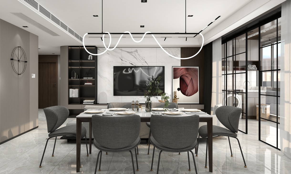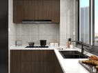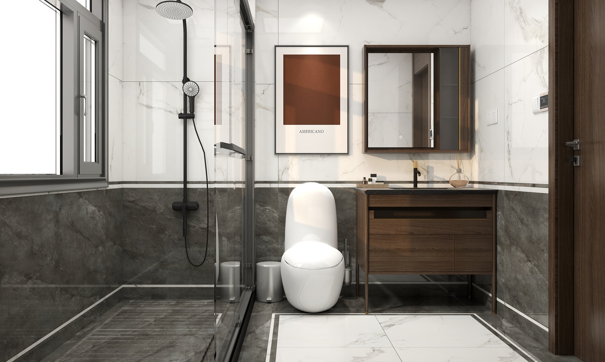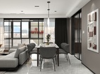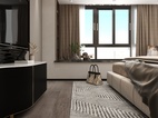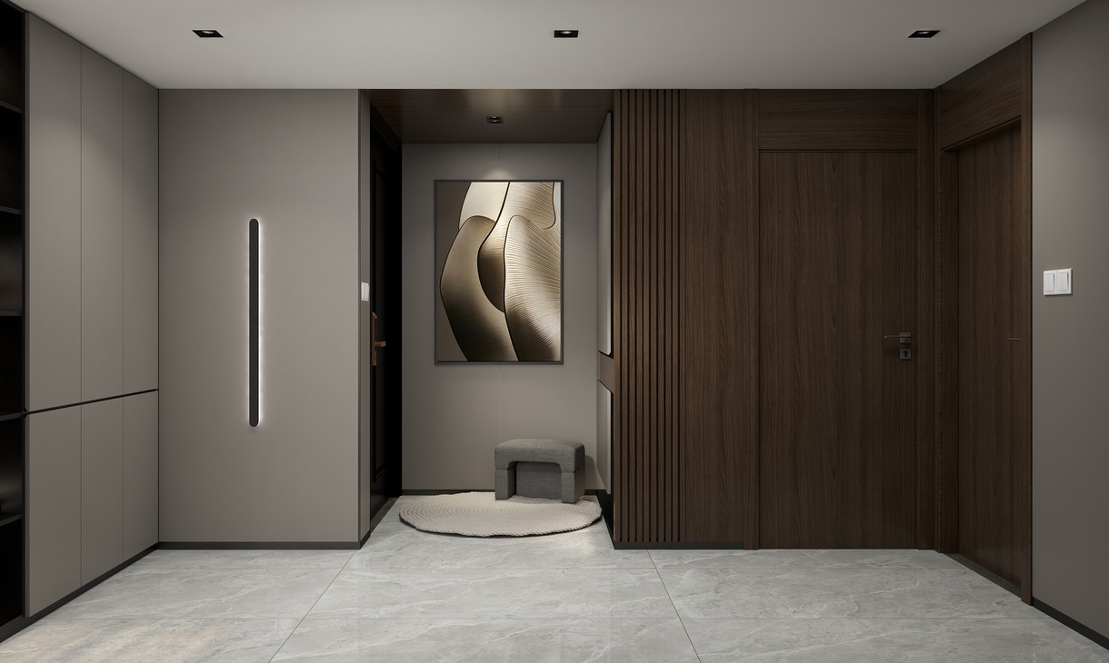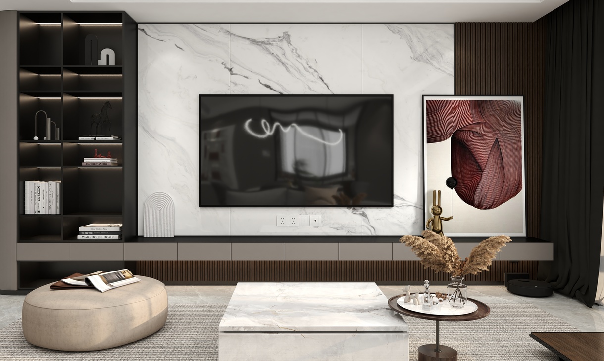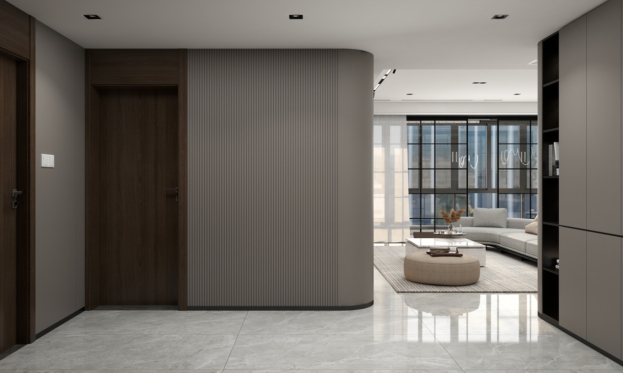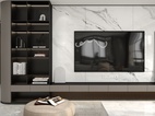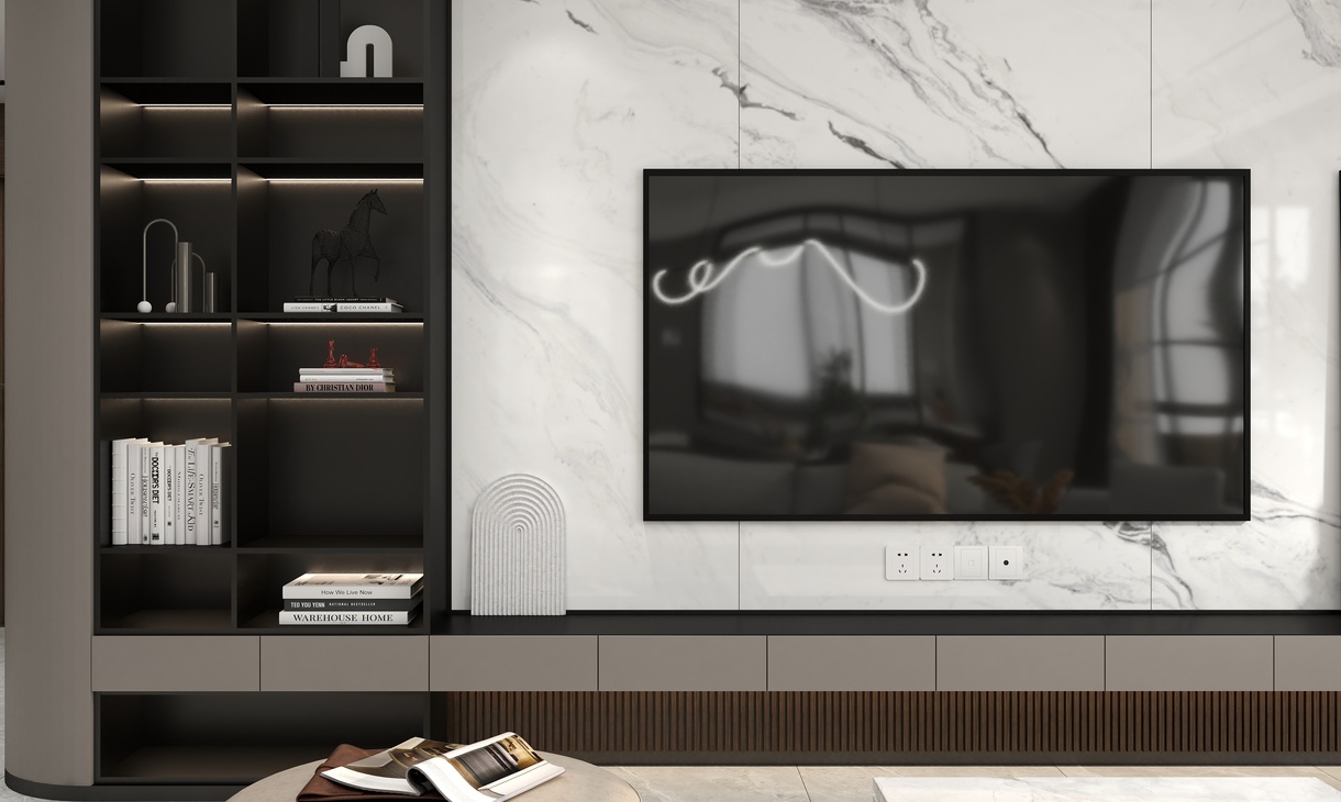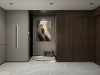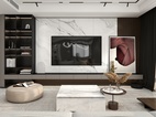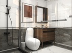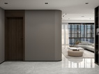 高级灰现代风设计方案。瓷砖为750*1500规格,75022#雅士浅灰。深色的柜体于胡桃木的搭配,营造出高端的质感。