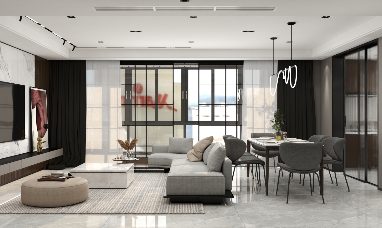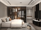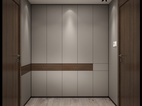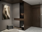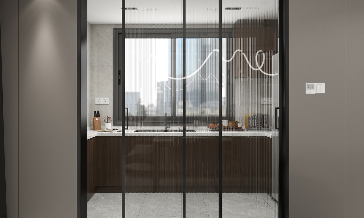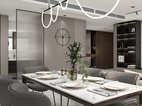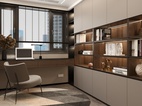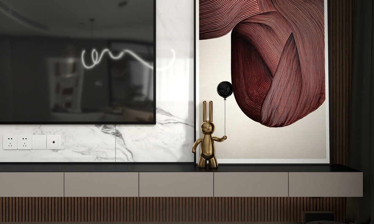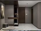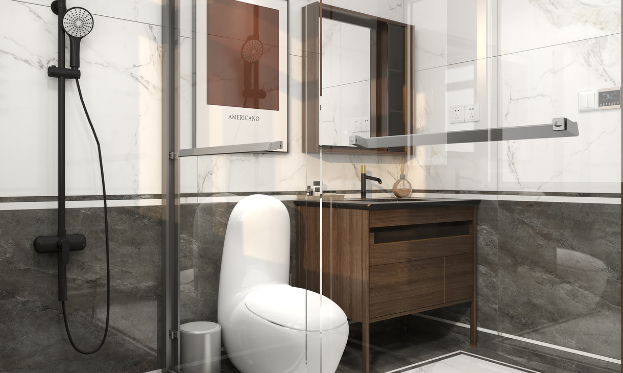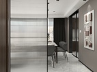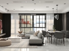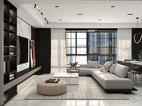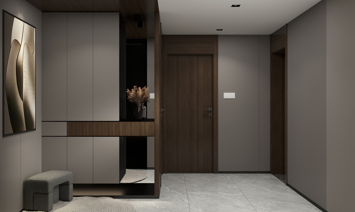 高级灰现代风设计方案。瓷砖为750*1500规格,75022#雅士浅灰。深色的柜体于胡桃木的搭配,营造出高端的质感。