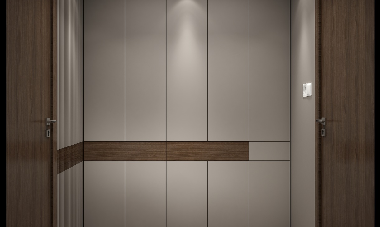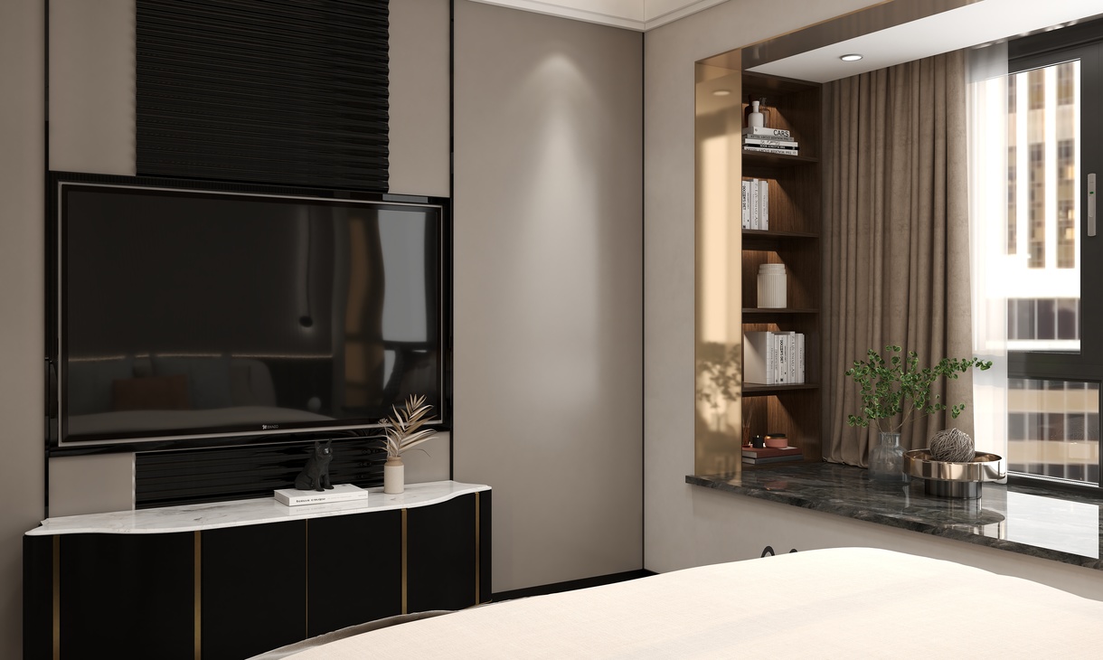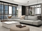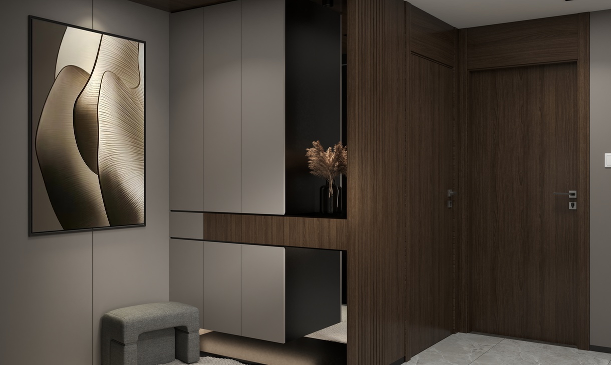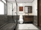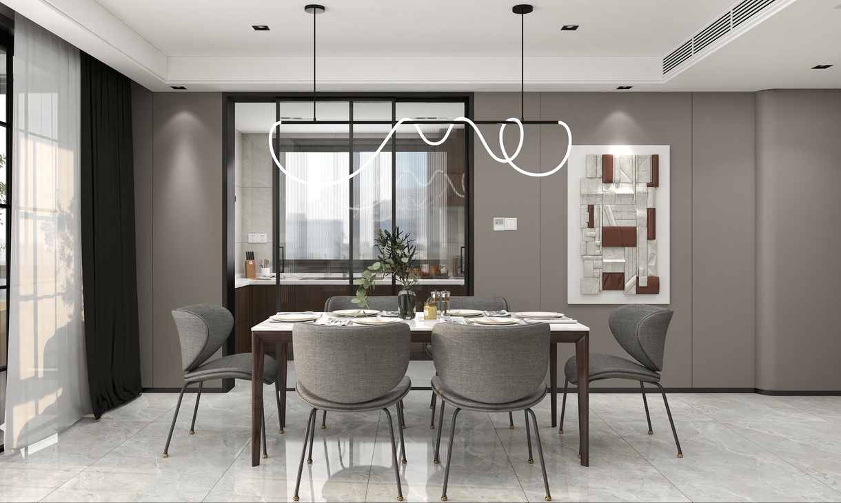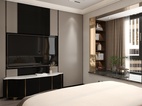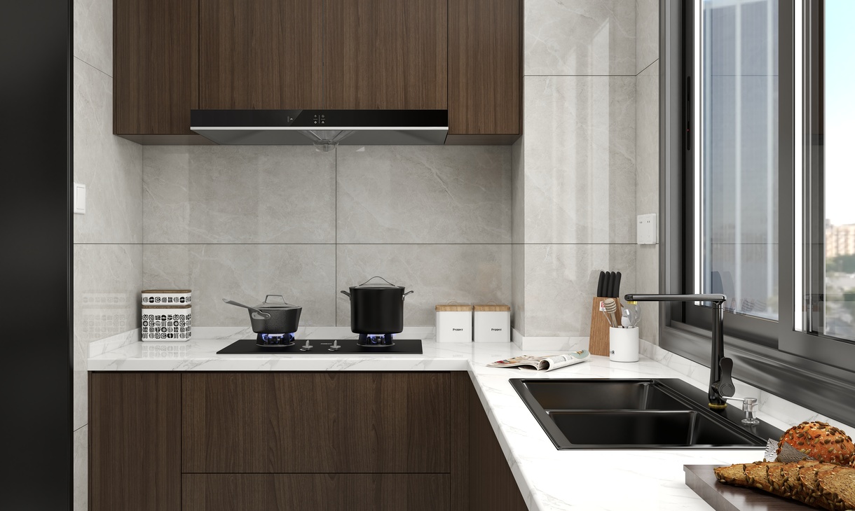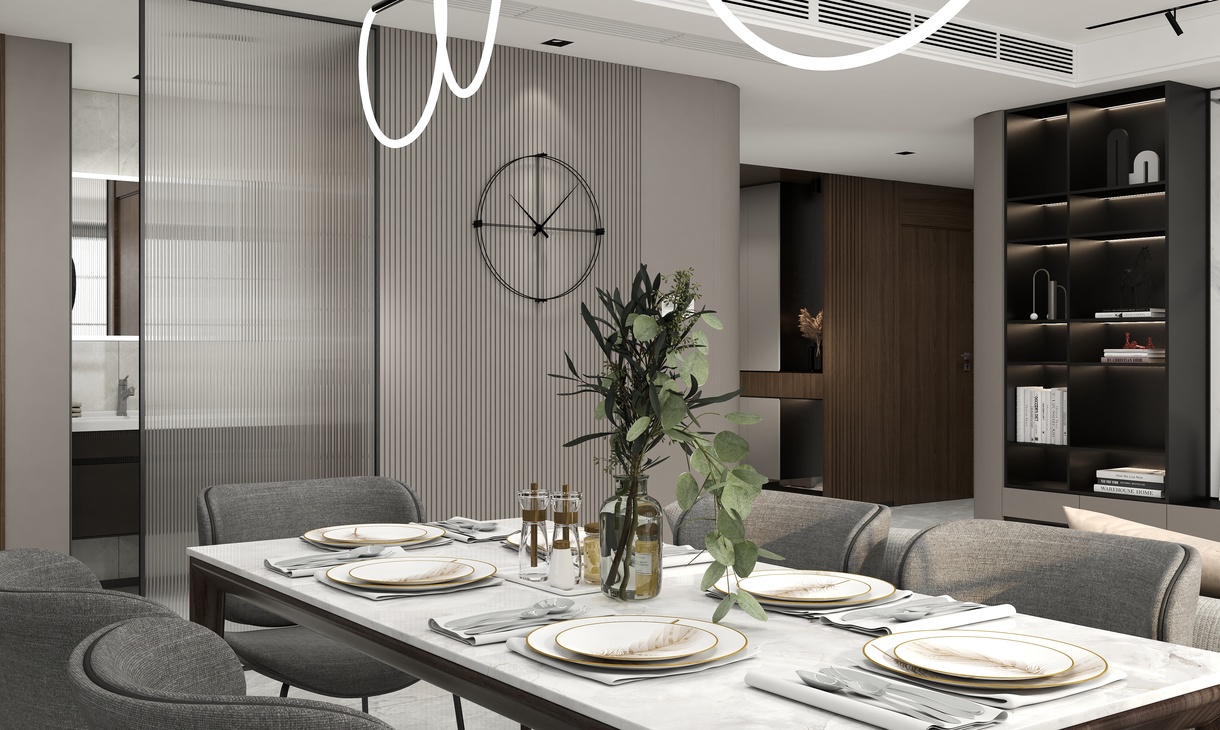 高级灰现代风设计方案。瓷砖为750*1500规格,75022#雅士浅灰。深色的柜体于胡桃木的搭配,营造出高端的质感。