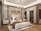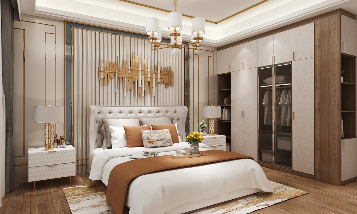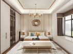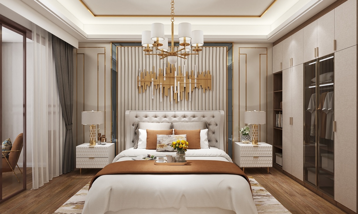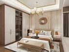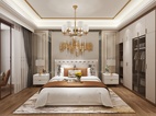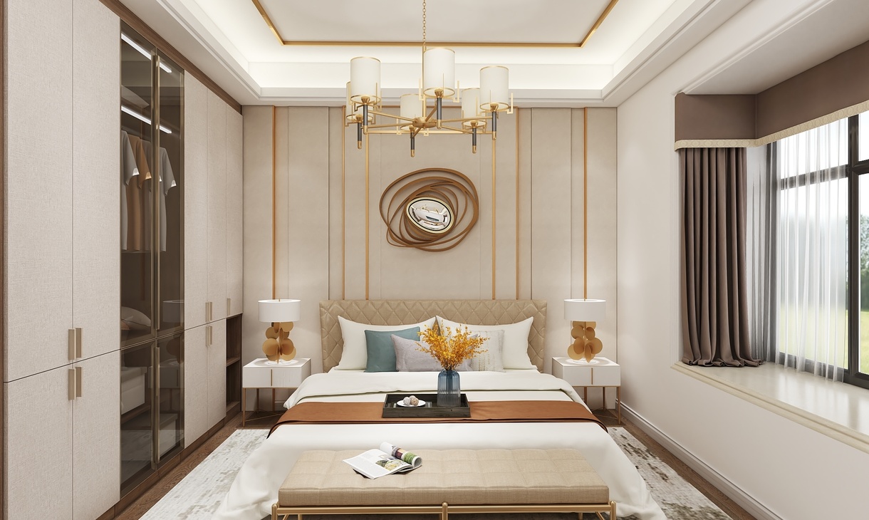 在整个室内空间规划中,主卧用色整体上更明亮一些,纯白的墙面加上简约的线条,高高的床背与金色饰品在两侧暖黄色的灯光的映衬下,尽显高贵典雅。配合灰色的布艺窗帘,让空间的色彩层次丰富起来。悠闲之时坐在阳台的沙发上,仰望星空,享受着难得的安静与欢愉。