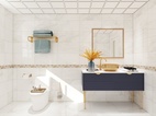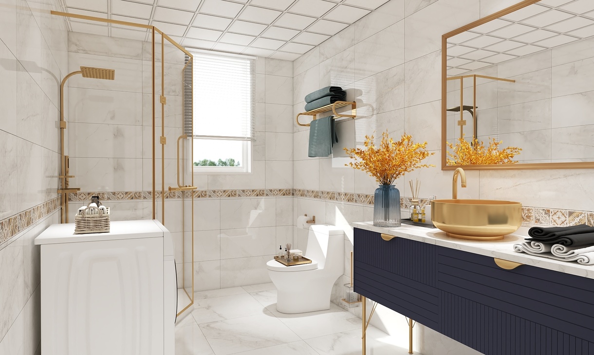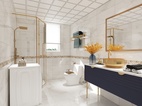 推门进入,右侧靠放白色台面的金属台盆洗手池,下方则是黄铜拉手的蓝色柜组,储物能力强大。卫生间干湿分离,淋浴区垫高,使用白色防滑小方砖。淋浴房旁摆放了洗衣机,随处可见的日常用品点缀空间,生活气息浓厚。