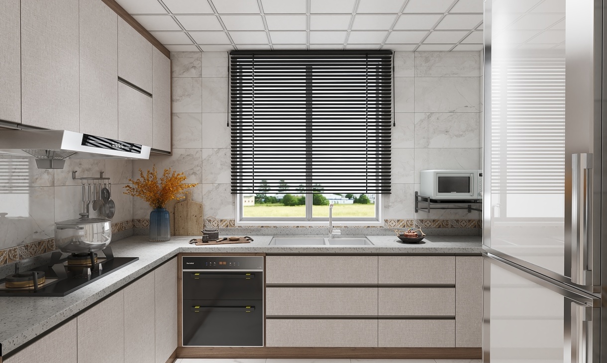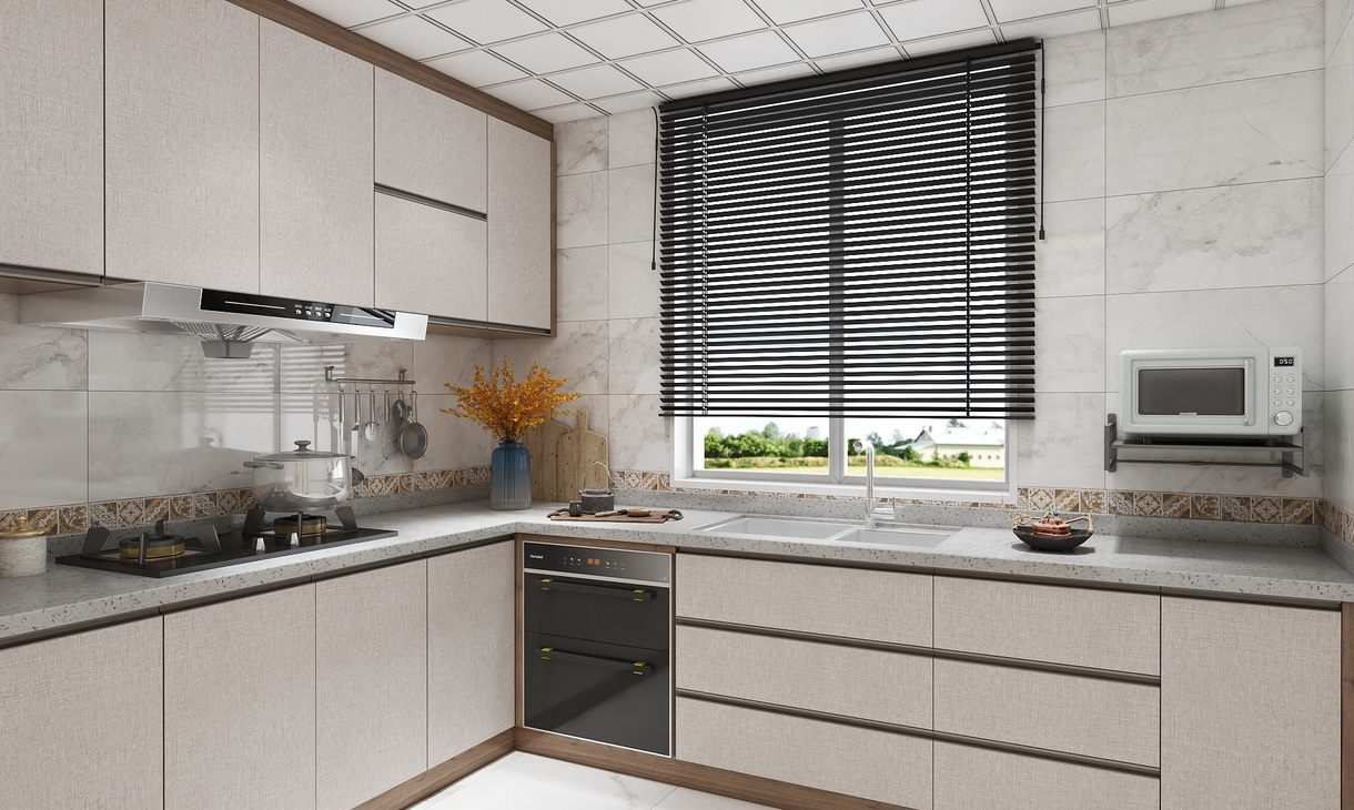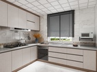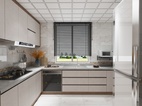 实木的橱柜储物柜配以褐色勾边,整个厨房的动线流畅,空间布局大气。