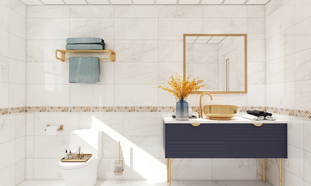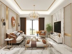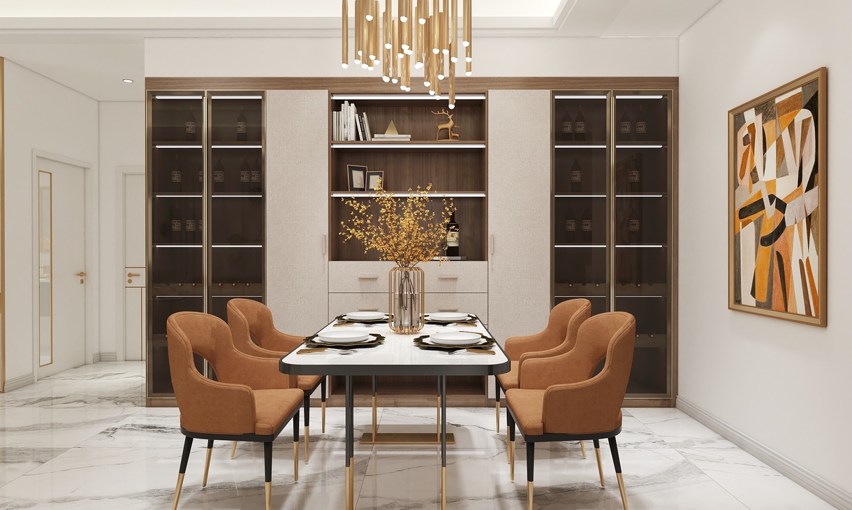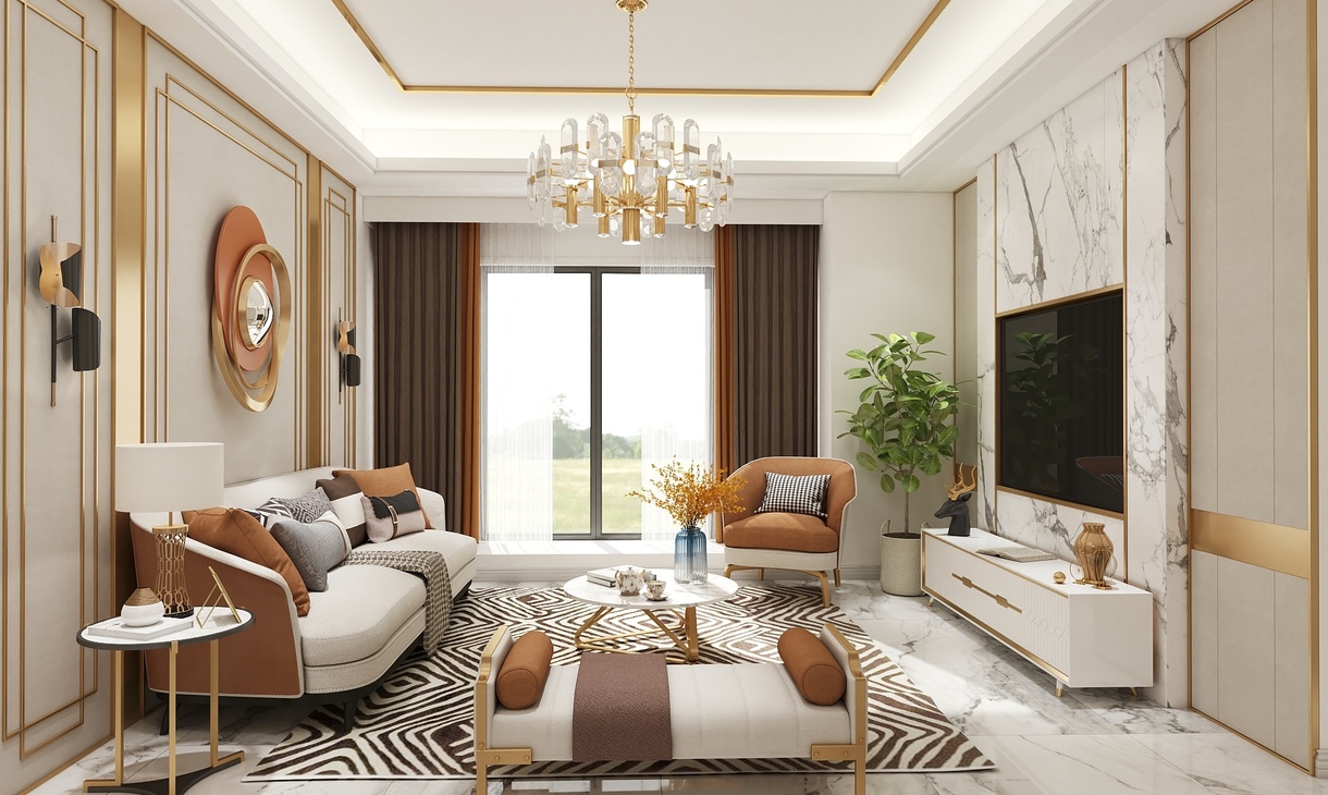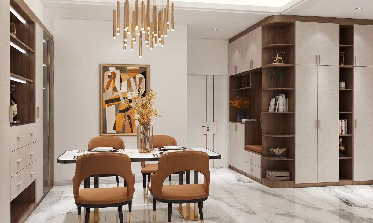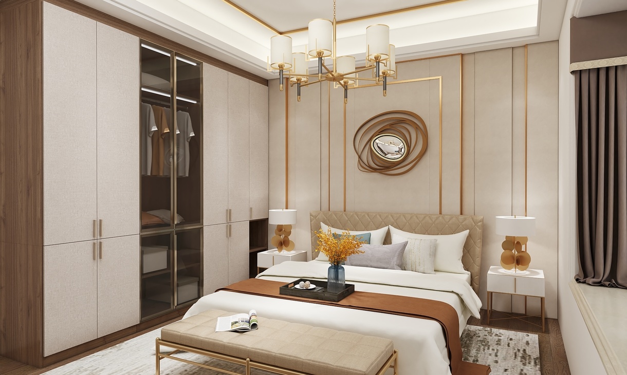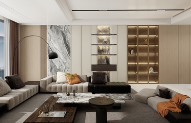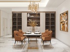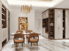 采用了后现代轻奢的风格,在大面积浅色护墙和大理石地砖的基础上,揉入黄铜金属色的沉稳和耐用的质感,吊顶的压边、主灯、柜门的拉手、家具、各种细节的金属元素适当点缀让素净的空间更加生动有层次,美的自带光芒却不张扬。