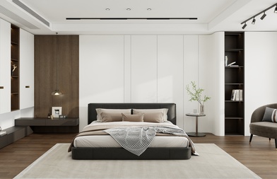 客卧的风格上以舒适、质朴为主。布艺大床质朴又有品质,床对面的电视机柜组收纳空间充足。同样利用承重墙的角度做了柜子,让空间的收纳功能更强大,更整洁。