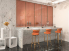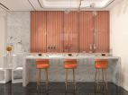 在餐厅,采用吧台形式,用餐区的重点是吊灯。装饰着柔软的面板,并由美丽的铜杆和玻璃组成。