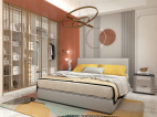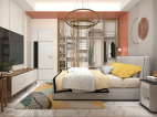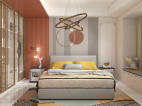 主卧设计最抢眼的为直行灯带,圆形墙饰,简洁而有个性与隔墙方正形成鲜明对比。