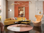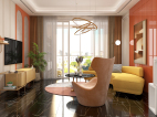 客厅,沙发刻意挑选可坐可躺款型满足贵族慵懒生活需要,吊灯得照耀下沙发面料与细节得以精彩呈现,空间主要以橘色为主,烤漆柜体的温润,凸显出空间的稳重,个性十足的单椅增添了空间层次感。